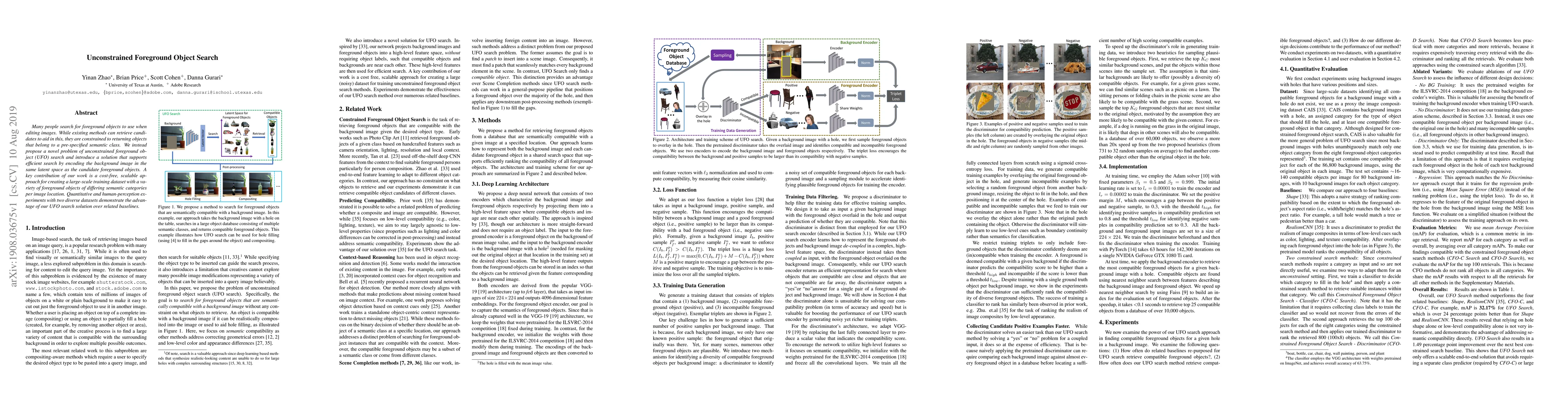 Many people search for foreground objects to use when editing images. While existing methods can retrieve candidates to aid in this, they are constrained to returning objects that belong to a pre-specified semantic class. We instead propose a novel problem of unconstrained foreground object (UFO) search and introduce a solution that supports efficient search by encoding the background image in the same latent space as the candidate foreground objects. A key contribution of our work is a cost-free, scalable approach for creating a large-scale training dataset with a variety of foreground objects of differing semantic categories per image location. Quantitative and human-perception experiments with two diverse datasets demonstrate the advantage of our UFO search solution over related baselines.