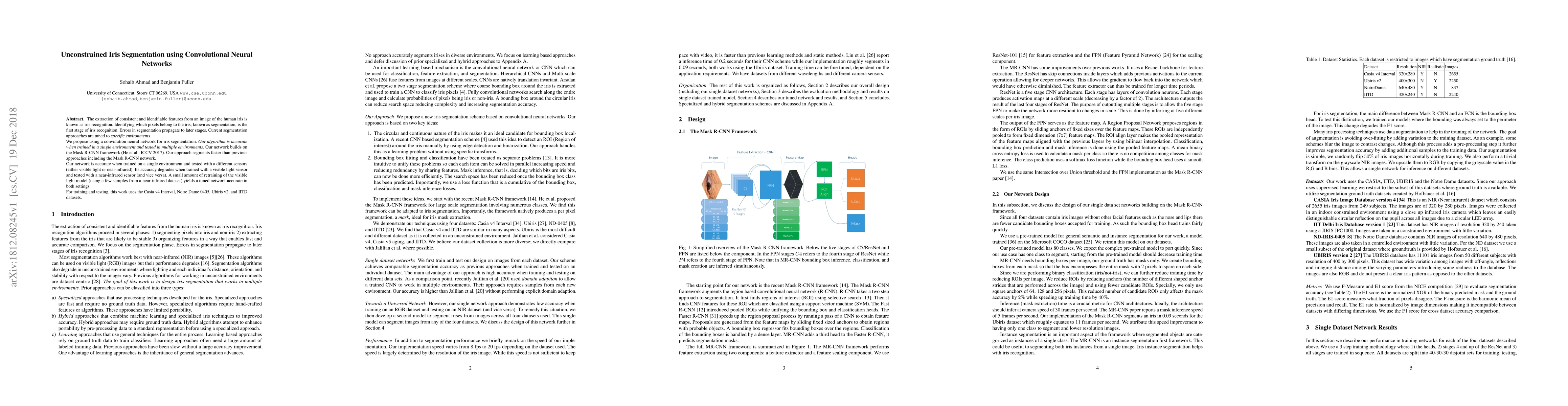 This paper proposes a convolutional neural network for unconstrained iris segmentation, leveraging the Mask R-CNN framework for improved accuracy across different environments. The network shows faster segmentation and adaptability to various sensors, though requires retraining for optimal performance across visible light and near-infrared settings.