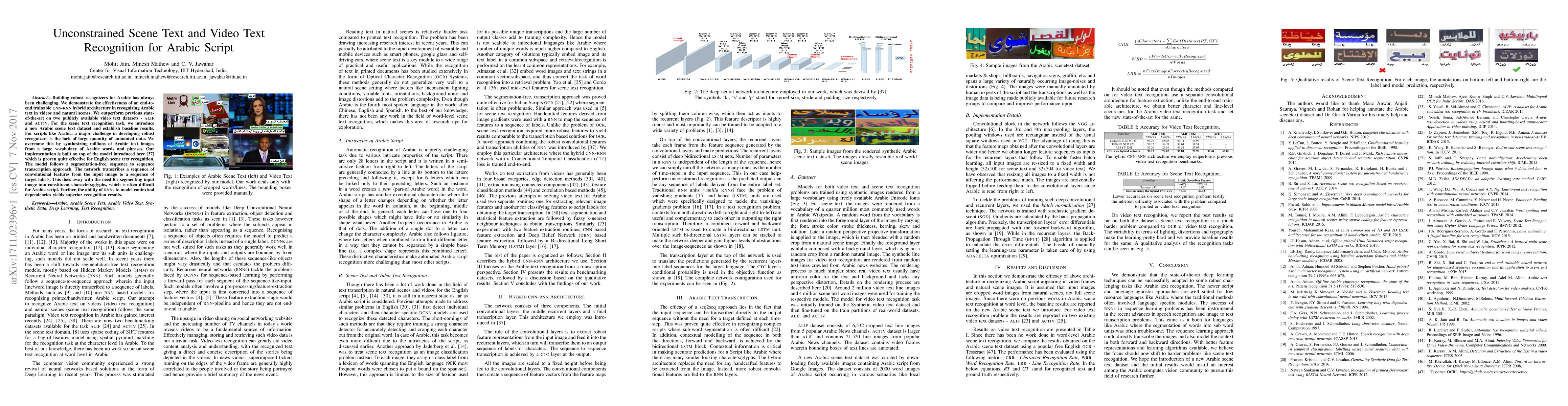 This paper presents an end-to-end CNN-RNN hybrid model for recognizing Arabic text in videos and natural scenes, outperforming previous methods on two datasets. The authors address data scarcity by synthesizing millions of text images, employing a segmentation-free sequence-to-sequence transcription approach for improved recognition.