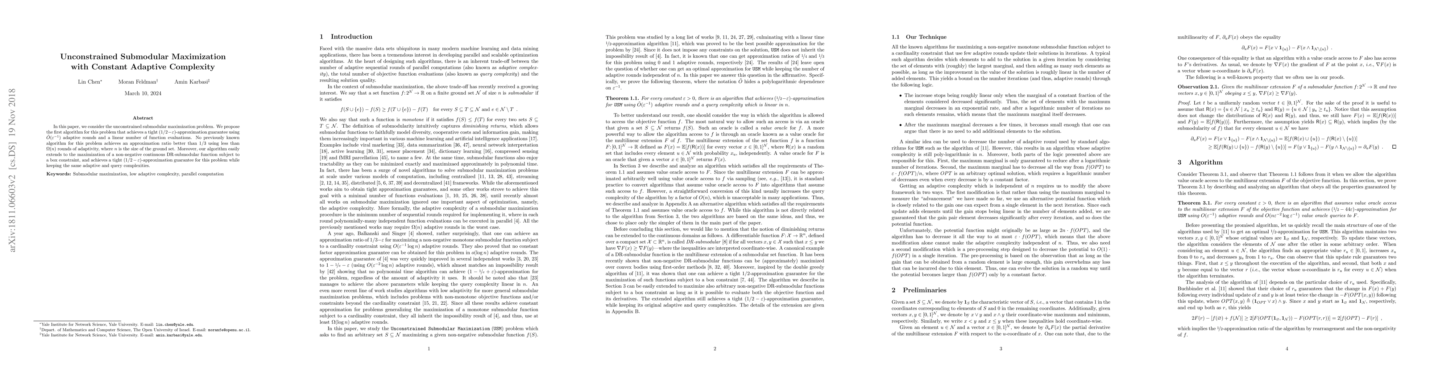 This paper introduces a novel algorithm for unconstrained submodular maximization that achieves a $(1/2-\varepsilon)$-approximation with $\tilde{O}(\varepsilon^{-1})$ adaptive rounds and linear function evaluations, surpassing previous algorithms that had a $1/3$ approximation ratio and required $\Omega(n)$ rounds. The algorithm also extends to maximize DR-submodular functions under box constraints.