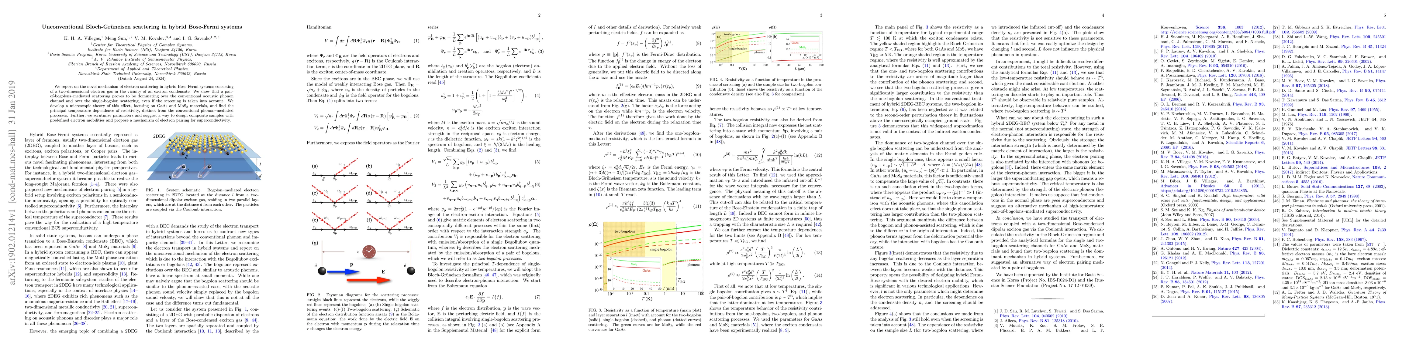 This paper investigates a novel scattering mechanism in hybrid Bose-Fermi systems involving electron gas near an exciton condensate, where pair-of-bogolons-mediated scattering dominates over conventional phonon channels. The study develops a microscopic theory for GaAs and MoS$_2$ materials, revealing a unique temperature dependence of resistivity and proposing methods for designing samples with specific electron mobilities and potential for superconductivity.