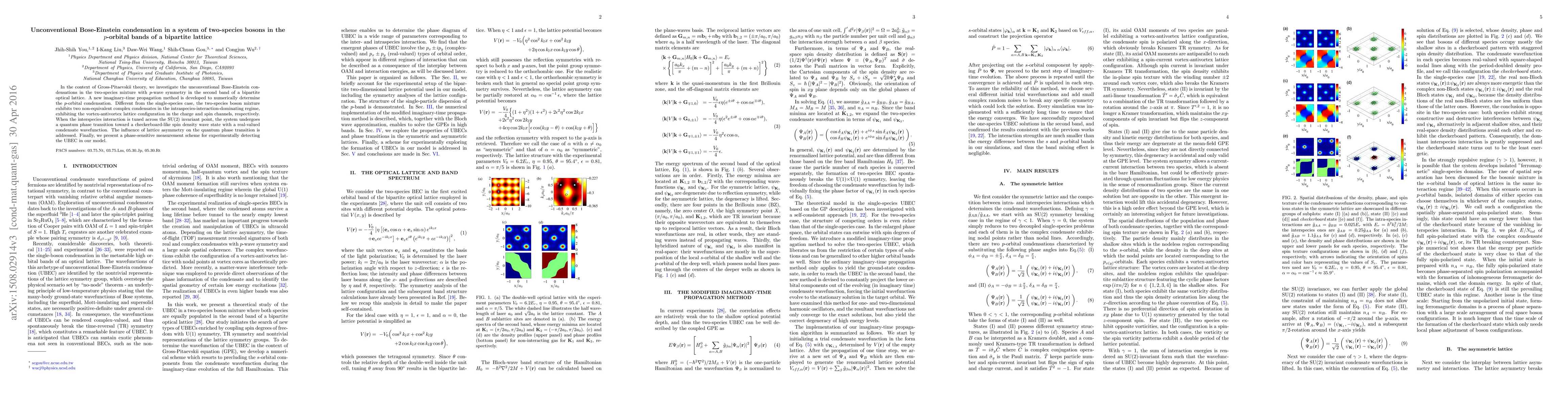 This paper explores unconventional Bose-Einstein condensation in a two-species boson mixture with $p$-wave symmetry in a bipartite optical lattice, revealing distinct complex condensates and a quantum phase transition to a spin density wave state, with a proposed method for experimental detection.