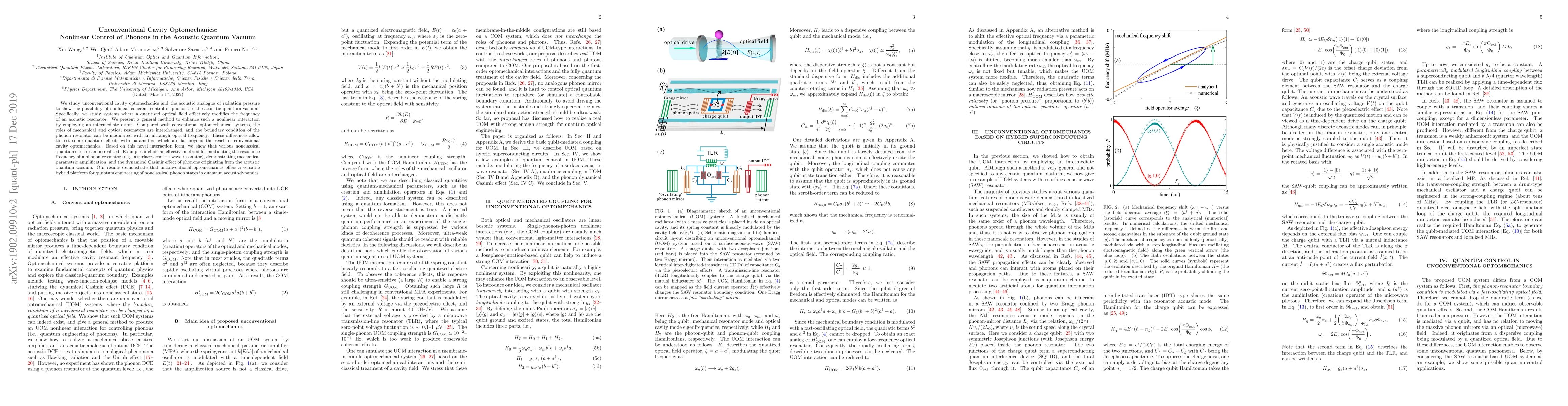 This paper explores unconventional cavity optomechanics to demonstrate nonlinear coherent control of phonons in the acoustic quantum vacuum, utilizing an intermediate qubit to enhance the interaction. It proposes a novel interaction form that allows for the modulation of phonon resonators with ultrahigh optical frequencies, enabling the realization of various nonclassical quantum effects.