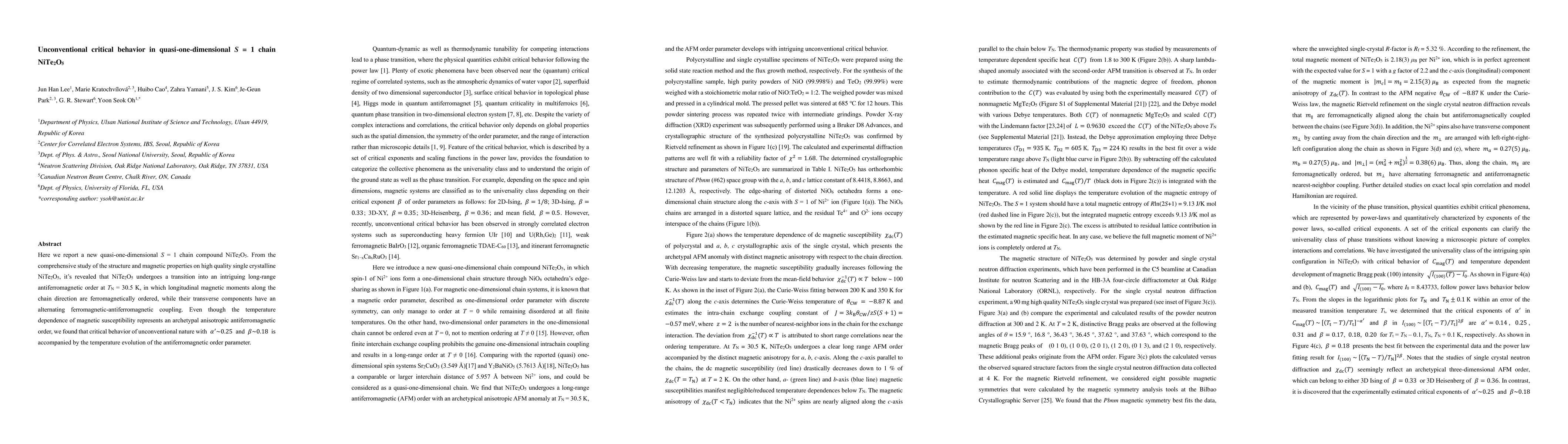 Here we report a new quasi-one-dimensional $S$ = 1 chain compound NiTe$_{2}$O$_{5}$. From the comprehensive study of the structure and magnetic properties on high quality single crystalline NiTe$_{2}$O$_{5}$, it's revealed that NiTe$_{2}$O$_{5}$ undergoes a transition into an intriguing long-range antiferromagnetic order at $T_{\rm N}=30.5 {\rm K}$, in which longitudinal magnetic moments along the chain direction are ferromagnetically ordered, while their transverse components have an alternating ferromagnetic-antiferromagnetic coupling. Even though the temperature dependence of magnetic susceptibility represents an archetypal anisotropic antiferromagnetic order, we found that critical behavior of unconventional nature with $\alpha'\sim0.25$ and $\beta\sim0.18$ is accompanied by the temperature evolution of the antiferromagnetic order parameter.