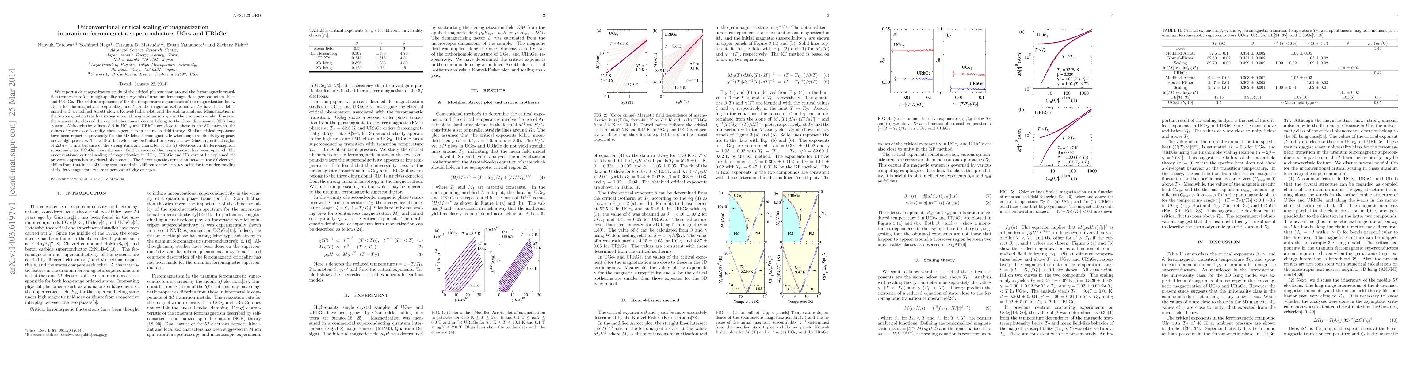 This study investigates the unconventional critical scaling of magnetization in uranium ferromagnetic superconductors UGe$_2$ and URhGe, finding critical exponents that do not conform to the 3D Ising model, suggesting a unique ferromagnetic correlation driven by the itinerant 5f electrons.