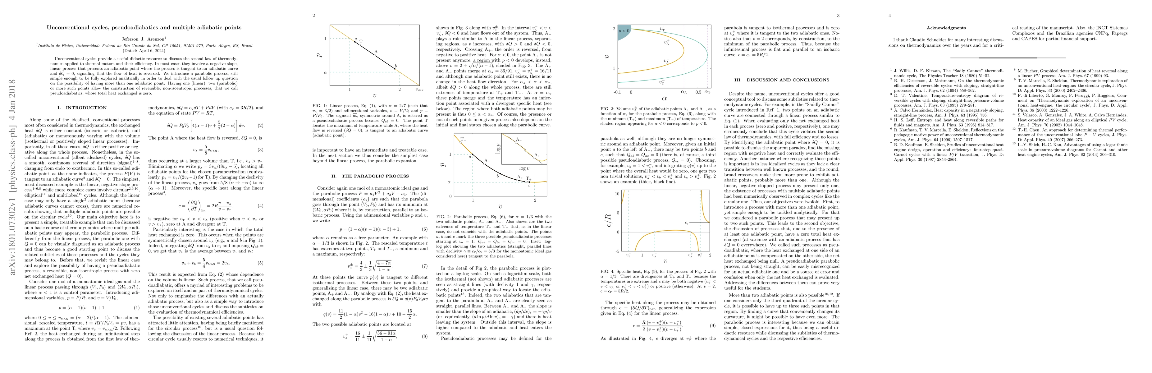 Unconventional cycles provide a useful didactic resource to discuss the second law of thermodynamics applied to thermal motors and their efficiency. In most cases they involve a negative slope, linear process that presents an adiabatic point where the process is tangent to an adiabatic curve and $\delta Q=0$, signalling that the flow of heat is reversed. We introduce a parabolic process, still simple enough to be fully explored analitically in order to deal with the usual follow up question on the possibility of having more than one adiabatic point. Having one (linear), two (parabolic) or more such points allow the construction of reversible, non-isoentropic processes, that we call pseudoadiabatics, whose total heat exchanged is zero.