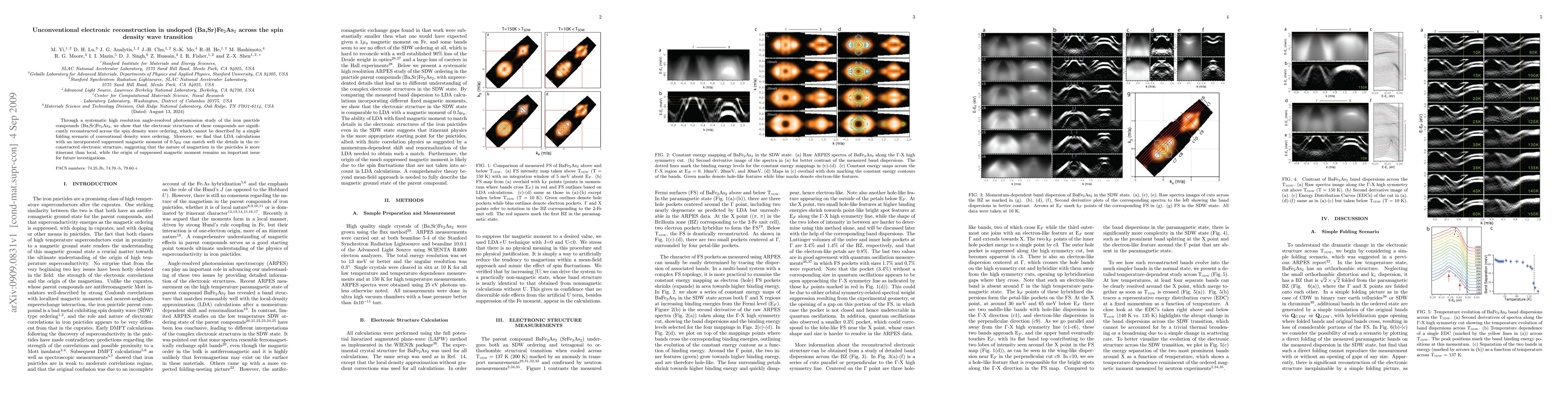 This study reveals significant electronic reconstruction in undoped (Ba,Sr)Fe$_2$As$_2$ across its spin density wave transition, challenging conventional density wave models. The findings suggest an itinerant magnetic nature in the pnictides, with LDA calculations incorporating a suppressed magnetic moment providing a good match to the observed electronic structure.