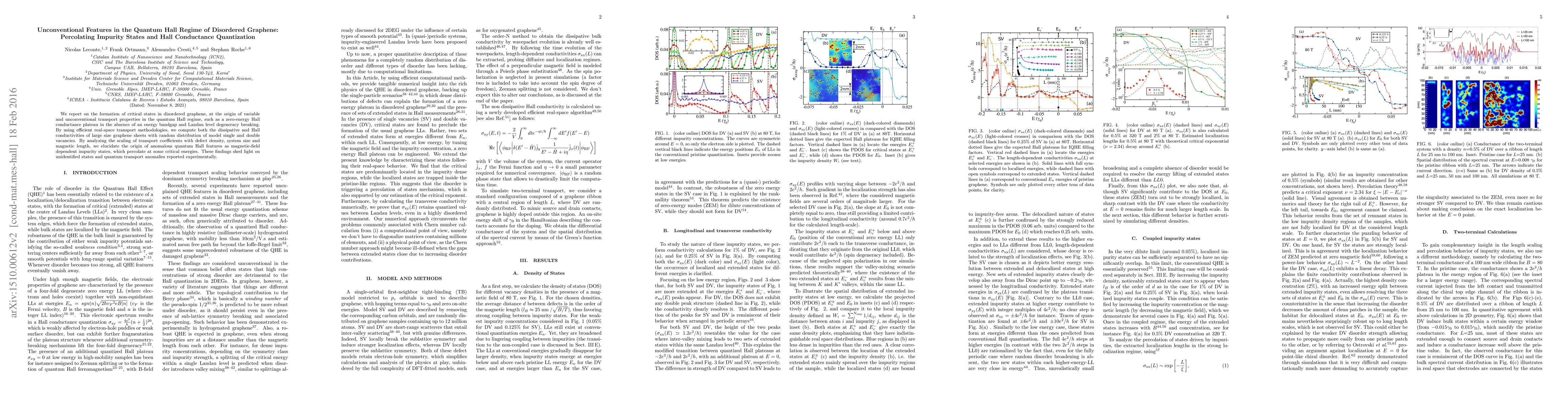 This paper investigates unconventional transport properties in disordered graphene in the quantum Hall regime, revealing zero-energy Hall conductance plateaus and Landau level degeneracy breaking. The study identifies critical states and percolating impurity states as the origin of these anomalies, providing insights into experimental observations of unidentified quantum transport phenomena.