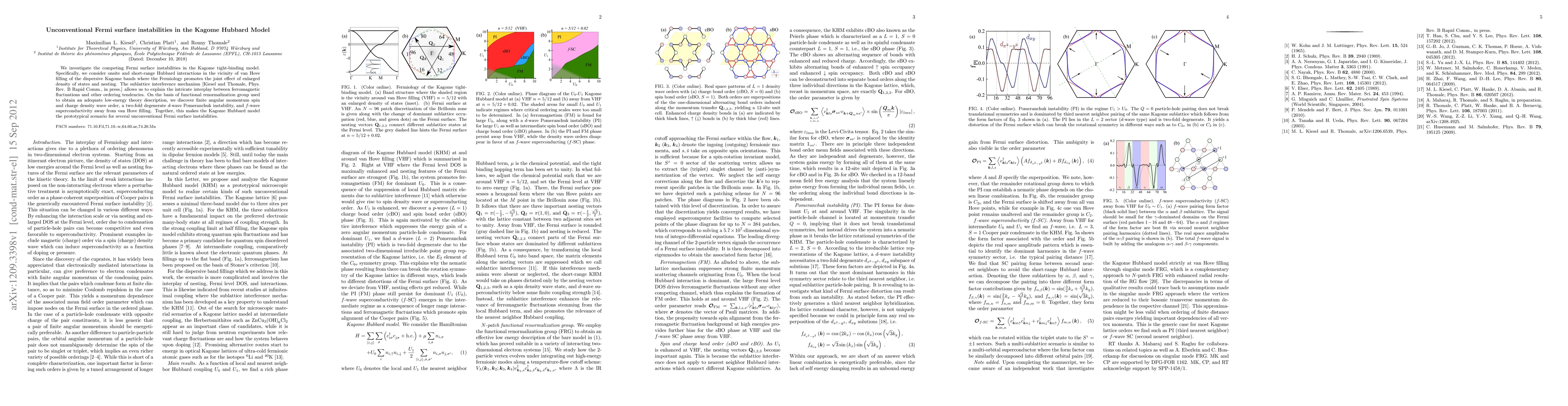 We investigate the competing Fermi surface instabilities in the Kagome tight-binding model. Specifically, we consider onsite and short-range Hubbard interactions in the vicinity of van Hove filling of the dispersive Kagome bands where the Fermiology promotes the joint effect of enlarged density of states and nesting. The sublattice interference mechanism [Kiesel and Thomale, Phys. Rev. B Rapid Comm., in press.] allows us to explain the intricate interplay between ferromagnetic fluctuations and other ordering tendencies. On the basis of functional renormalization group used to obtain an adequate low-energy theory description, we discover finite angular momentum spin and charge density wave order, a two-fold degenerate d-wave Pomeranchuk instability, and f-wave superconductivity away from van Hove filling. Together, this makes the Kagome Hubbard model the prototypical scenario for several unconventional Fermi surface instabilities.