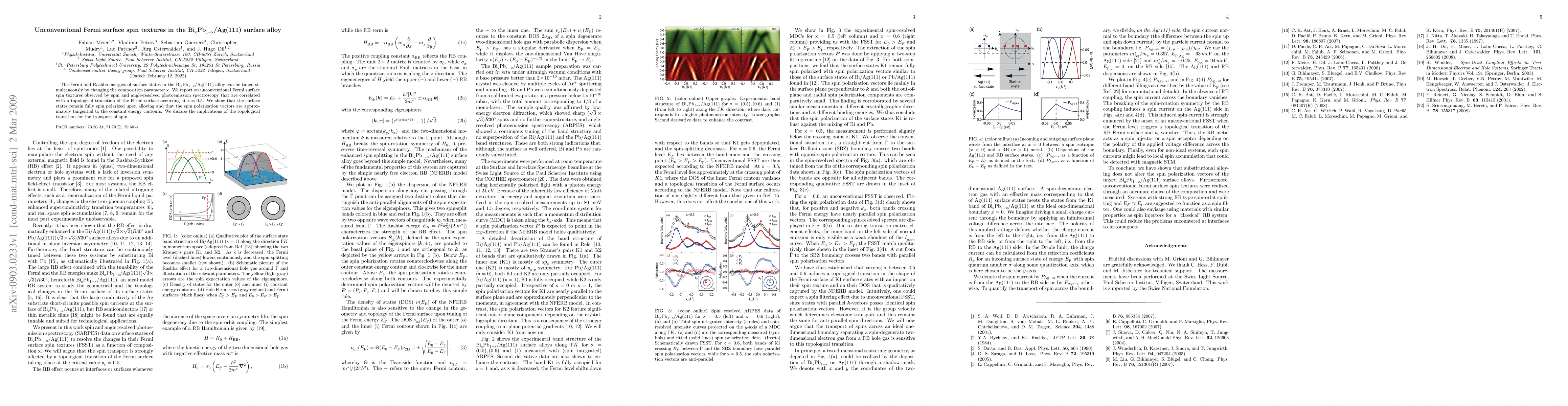 The Fermi and Rashba energies of surface states in the Bi_xPb_{1-x}/Ag(111) alloy can be tuned simultaneously by changing the composition parameter x. We report on unconventional Fermi surface spin textures observed by spin and angle-resolved photoemission spectroscopy {that are correlated with a topological transition of the Fermi surface occurring at x=0.5. We show that the surface states remain fully spin polarized upon alloying and that the spin polarization vectors are approximately tangential to the constant energy contours. We discuss the implications of the topological transition for the transport of spin.