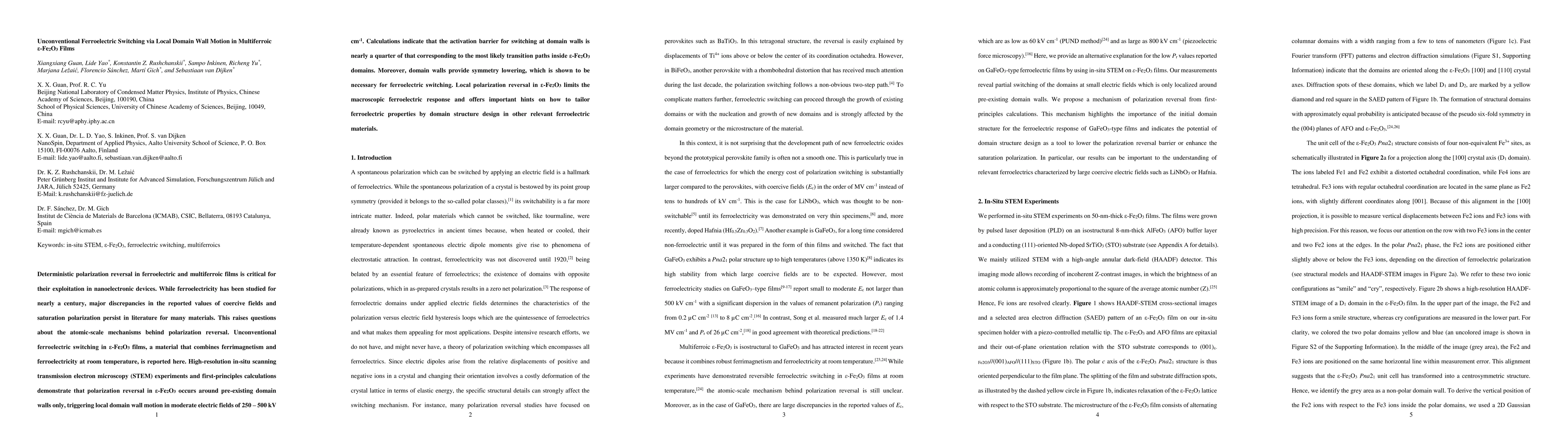 Deterministic polarization reversal in ferroelectric and multiferroic films is critical for their exploitation in nanoelectronic devices. While ferroelectricity has been studied for nearly a century, major discrepancies in the reported values of coercive fields and saturation polarization persist in literature for many materials. This raises questions about the atomic-scale mechanisms behind polarization reversal. Unconventional ferroelectric switching in $\epsilon$-Fe2O3 films, a material that combines ferrimagnetism and ferroelectricity at room temperature, is reported here. High-resolution in-situ scanning transmission electron microscopy (STEM) experiments and first-principles calculations demonstrate that polarization reversal in $\epsilon$-Fe2O3 occurs around pre-existing domain walls only, triggering local domain wall motion in moderate electric fields of 250 - 500 kV/cm. Calculations indicate that the activation barrier for switching at domain walls is nearly a quarter of that corresponding to the most likely transition paths inside $\epsilon$-Fe2O3 domains. Moreover, domain walls provide symmetry lowering, which is shown to be necessary for ferroelectric switching. Local polarization reversal in $\epsilon$-Fe2O3 limits the macroscopic ferroelectric response and offers important hints on how to tailor ferroelectric properties by domain structure design in other relevant ferroelectric materials.