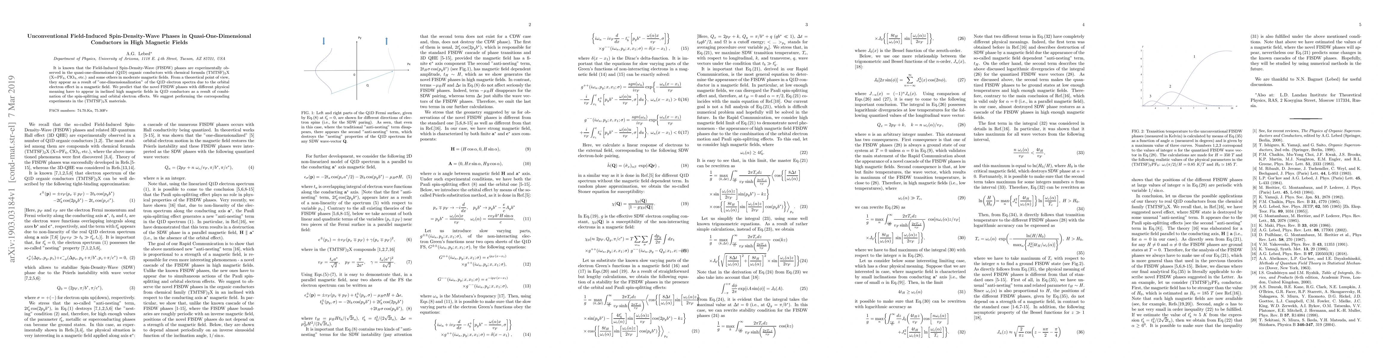 This paper investigates the emergence of unconventional Field-Induced Spin-Density-Wave (FISDW) phases in quasi-one-dimensional organic conductors under high magnetic fields, predicting novel FISDW phases due to spin-splitting and orbital electron effects. The study suggests experimental verification in (TMTSF)$_2$X materials.