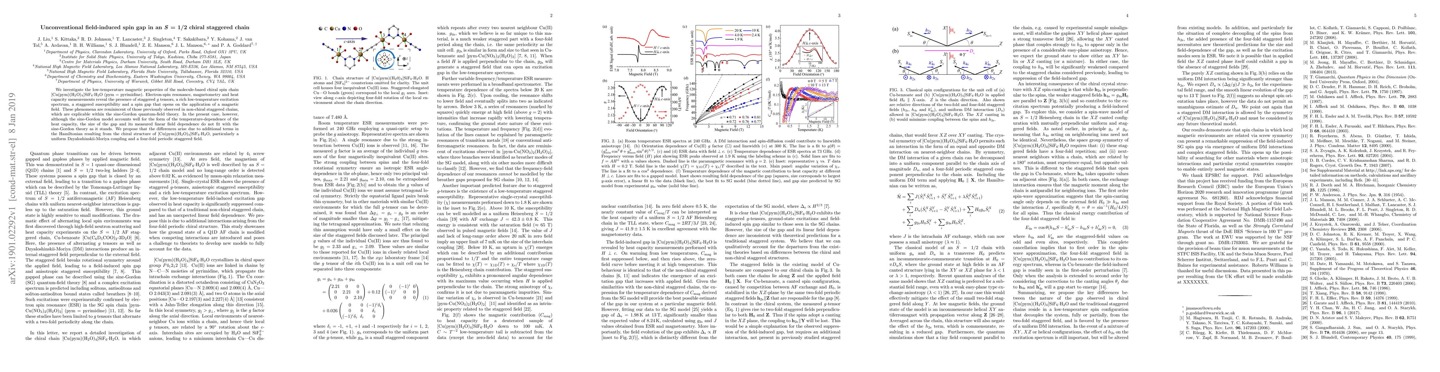 This study reveals the unusual magnetic properties of a chiral spin chain, including a field-induced spin gap, which deviates from the sine-Gordon model predictions. The chiral structure introduces additional Hamiltonian terms, such as Dzyaloshinskii-Moriya coupling and a staggered field, explaining the observed phenomena.