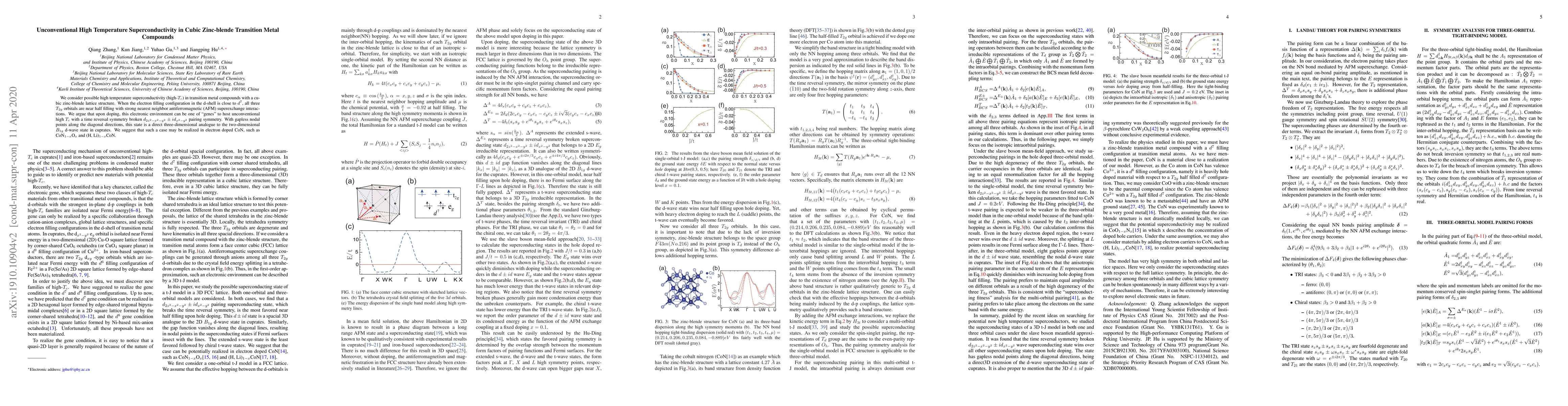 This paper explores the possibility of unconventional high-temperature superconductivity in cubic zinc-blende transition metal compounds, particularly when the d-shell electron configuration is near d$^7$. It proposes that doping could lead to a $d_{2z^2-x^2-y^2} \pm i d_{x^2-y^2}$ pairing symmetry, akin to the two-dimensional B$_{1g}$ d-wave state in cuprates, with potential realization in electron-doped cobalt nitride compounds.