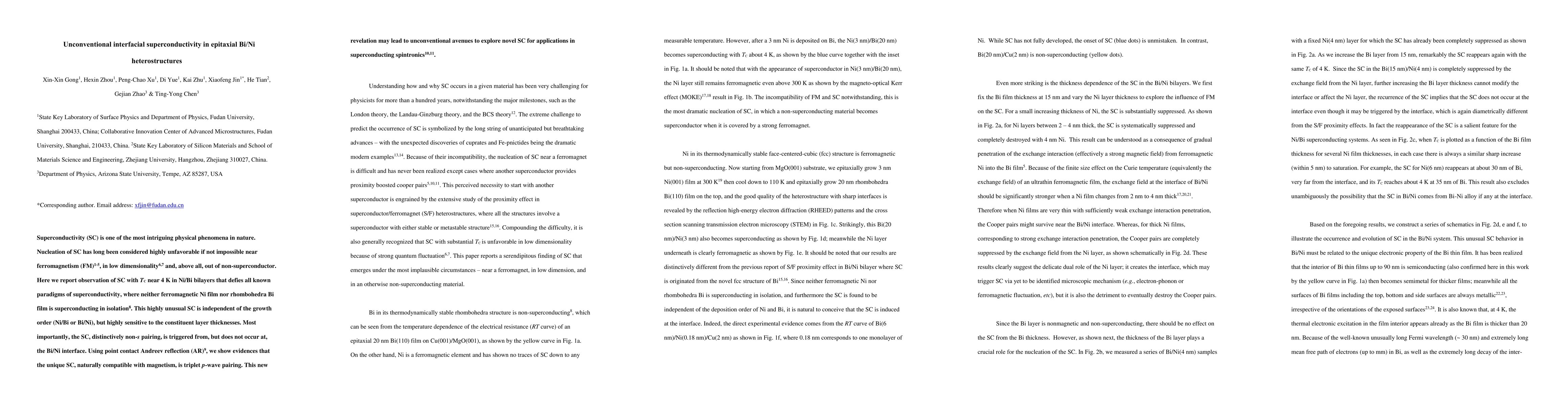 Superconductivity (SC) is one of the most intriguing physical phenomena in nature. Nucleation of SC has long been considered highly unfavorable if not impossible near ferromagnetism, in low dimensionality and, above all, out of non-superconductor. Here we report observation of SC with TC near 4 K in Ni/Bi bilayers that defies all known paradigms of superconductivity, where neither ferromagnetic Ni film nor rhombohedra Bi film is superconducting in isolation. This highly unusual SC is independent of the growth order (Ni/Bi or Bi/Ni), but highly sensitive to the constituent layer thicknesses. Most importantly, the SC, distinctively non-s pairing, is triggered from, but does not occur at, the Bi/Ni interface. Using point contact Andreev reflection, we show evidences that the unique SC, naturally compatible with magnetism, is triplet p-wave pairing. This new revelation may lead to unconventional avenues to explore novel SC for applications in superconducting spintronics.