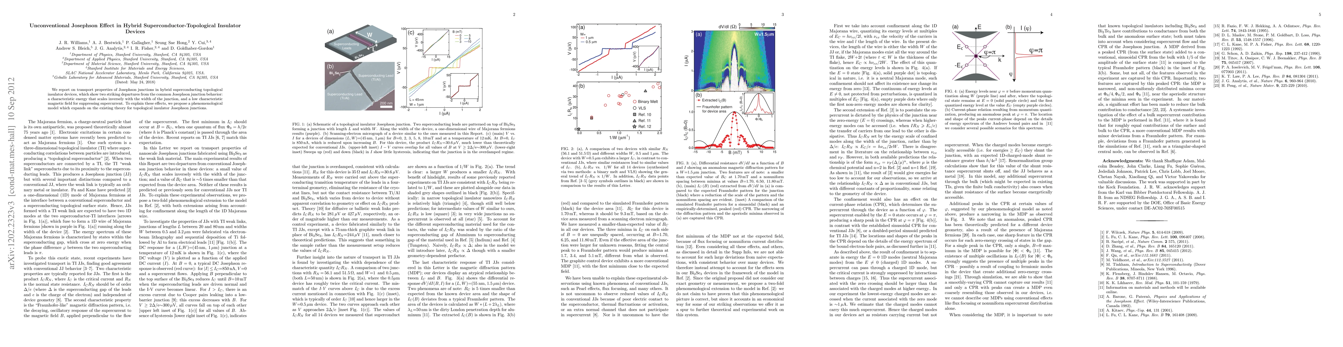 This paper investigates the transport properties of Josephson junctions in hybrid superconductor-topological insulator devices, revealing an unconventional Josephson effect with energy scaling inversely with junction width and a low magnetic field suppression of supercurrent. The authors propose a phenomenological model to explain these deviations from standard behavior.