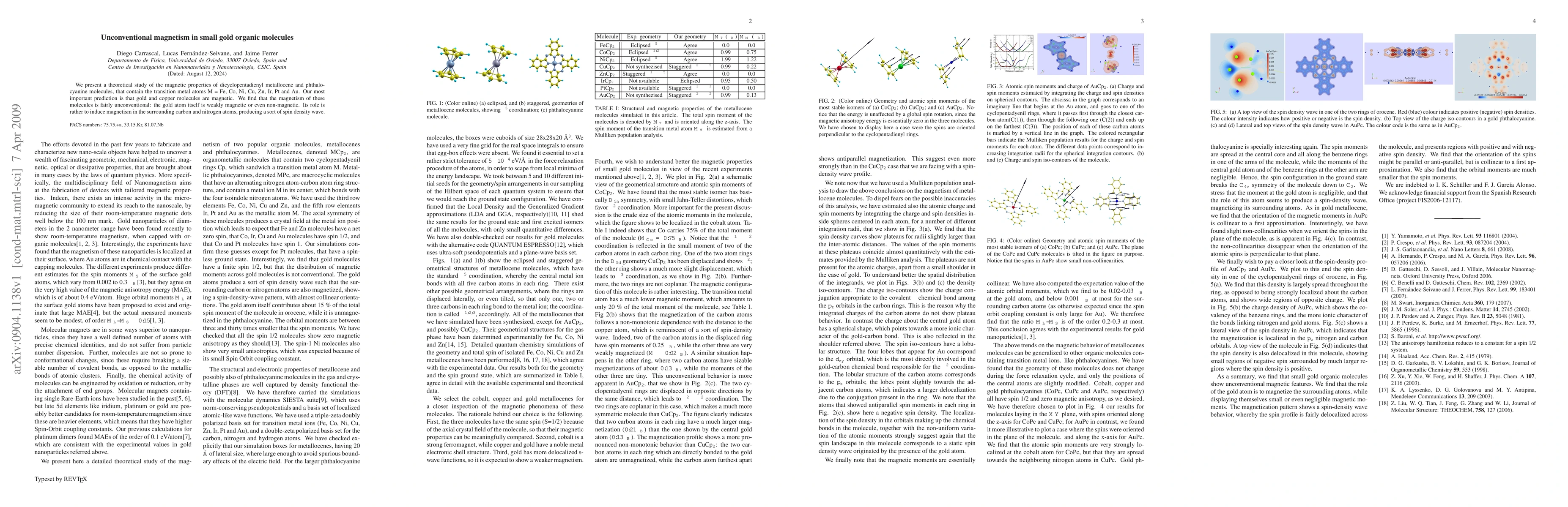 This study predicts that gold and copper-containing organic molecules exhibit magnetism, with the magnetism originating from induced spin density waves in carbon and nitrogen atoms rather than the gold or copper atoms themselves.
