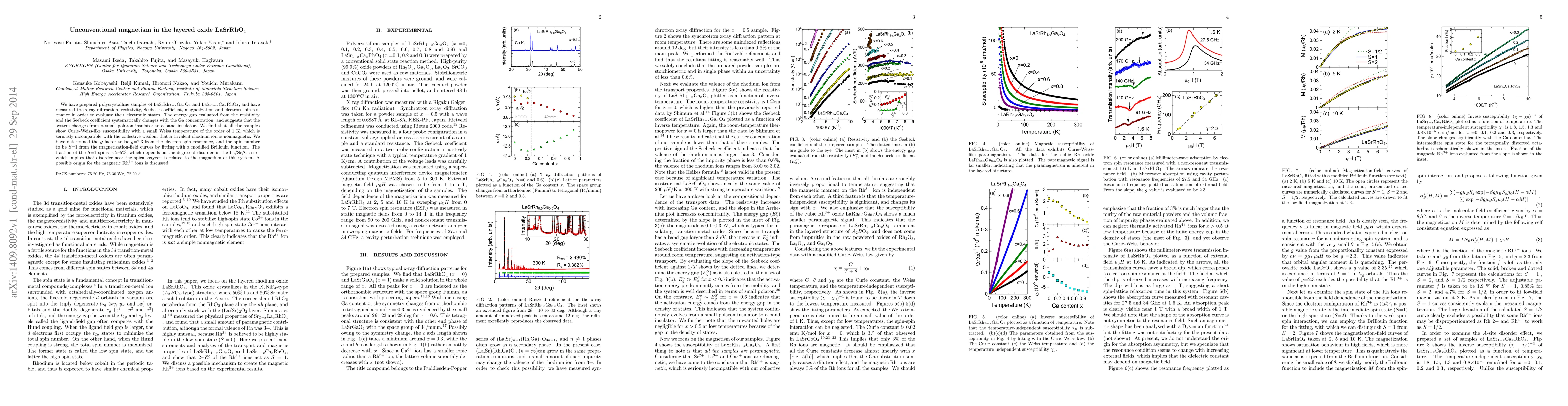 We have prepared polycrystalline samples of LaSrRh$_{1-x}$Ga$_x$O$_4$ and LaSr$_{1-x}$Ca$_x$RhO$_4$,and have measured the x-ray diffraction, resistivity, Seebeck coefficient, magnetization and electron spin resonance in order to evaluate their electronic states. The energy gap evaluated from the resistivity and the Seebeck coefficient systematically changes with the Ga concentration, and suggests that the system changes from a small polaron insulator to a band insulator. We find that all the samples show Curie-Weiss-like susceptibility with a small Weiss temperature of the order of 1 K, which is seriously incompatible with the collective wisdom that a trivalent rhodium ion is nonmagnetic. We have determined the $g$ factor to be $g$=2.3 from the electron spin resonance, and the spin number to be $S$=1 from the magnetization-field curves by fitting with a modified Brillouin function. The fraction of the $S$=1 spins is 2--5%, which depends on the degree of disorder in the La/Sr/Ca-site, which implies that disorder near the apical oxygen is related to the magnetism of this system. A possible origin for the magnetic Rh$^{3+}$ ions is discussed.