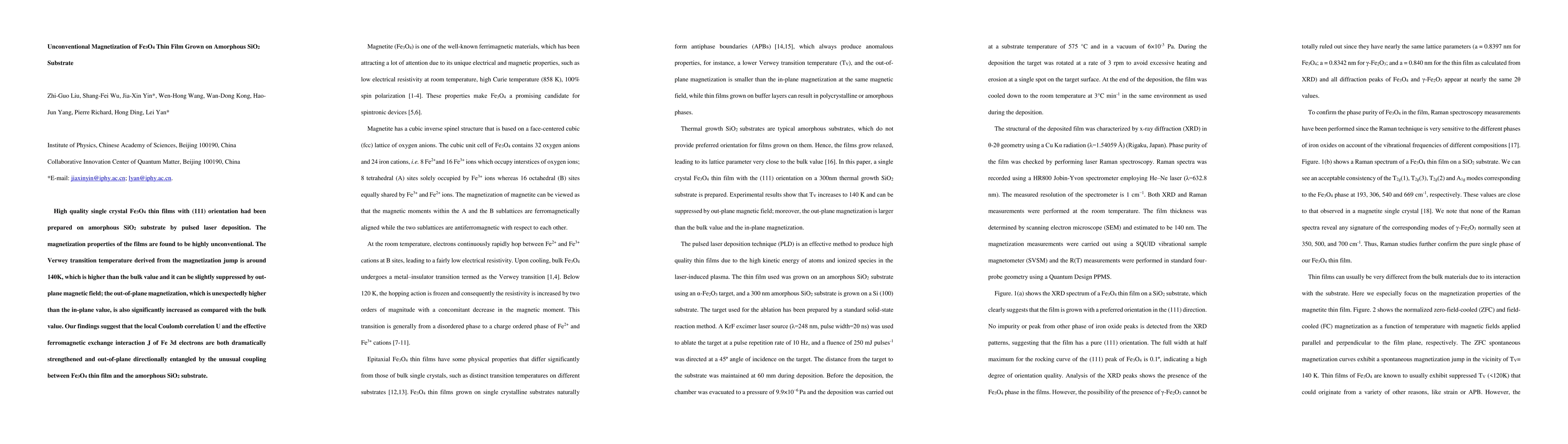 This study investigates Fe3O4 thin films grown on amorphous SiO2 substrates via pulsed laser deposition, revealing unconventional magnetization properties. The Verwey transition temperature is higher than in bulk Fe3O4 and can be suppressed by out-plane magnetic fields, while out-of-plane magnetization exceeds in-plane values, suggesting enhanced local Coulomb correlation and ferromagnetic exchange interactions due to substrate coupling.