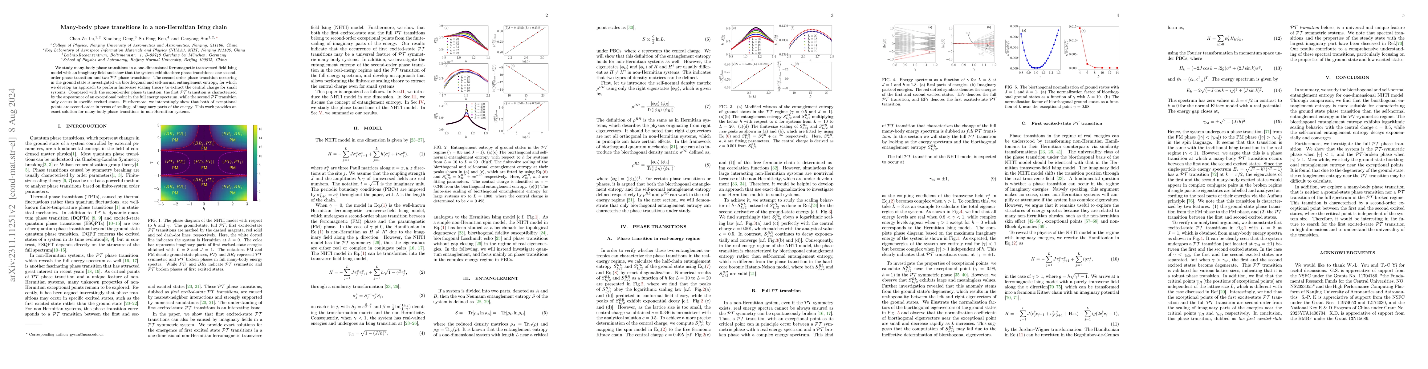 We study many-body phase transitions in a one-dimensional ferromagnetic transversed field Ising model with an imaginary field and show that the system exhibits three phase transitions: one second-order phase transition and two $\mathcal{PT}$ phase transitions. The second-order phase transition occurring in the ground state is investigated via biorthogonal and self-normal entanglement entropy, for which we develop an approach to perform finite-size scaling theory to extract the central charge for small systems. Compared with the second-order phase transition, the first $\mathcal{PT}$ transition is characterized by the appearance of an exceptional point in the full energy spectrum, while the second $\mathcal{PT}$ transition only occurs in specific excited states. Furthermore, we interestingly show that both of exceptional points are second-order in terms of scalings of imaginary parts of the energy. This work provides an exact solution for unconventional many-body phase transitions in non-Hermitian systems.