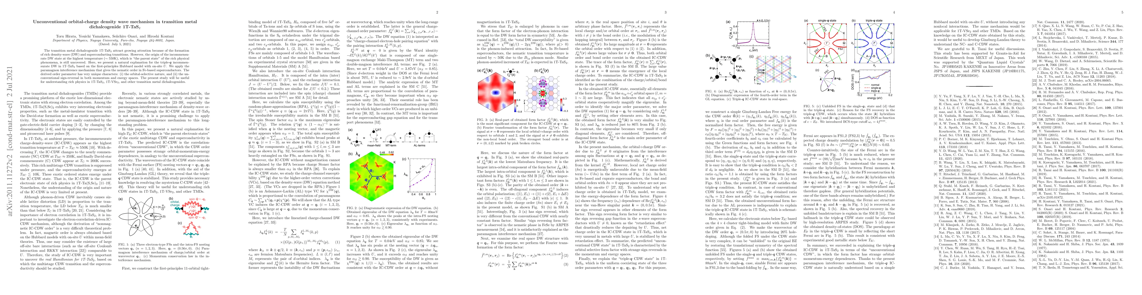 The transition metal dichalcogenide 1T-TaS2 attract growing attention because of the formation of rich density-wave (DW) and superconducting transitions. However, the origin of the incommensurate DW state at the highest temperature (~ 550 K), which is "the parent state" of the rich physical phenomena, is still uncovered. Here, we present a natural explanation for the triple-q incommensurate DW in 1T-TaS2 based on the first-principles Hubbard model with on-site U. We apply the paramagnon interference mechanism that gives the nematic order in Fe-based superconductors. The derived order parameter has very unique characters: (i) the orbital-selective nature, and (ii) the unconventional sign-reversal in both momentum and energy spaces. The present study will be useful for understanding rich physics in 1T-TaS2, 1T-VSe2, and other transition metal dichalcogenides.