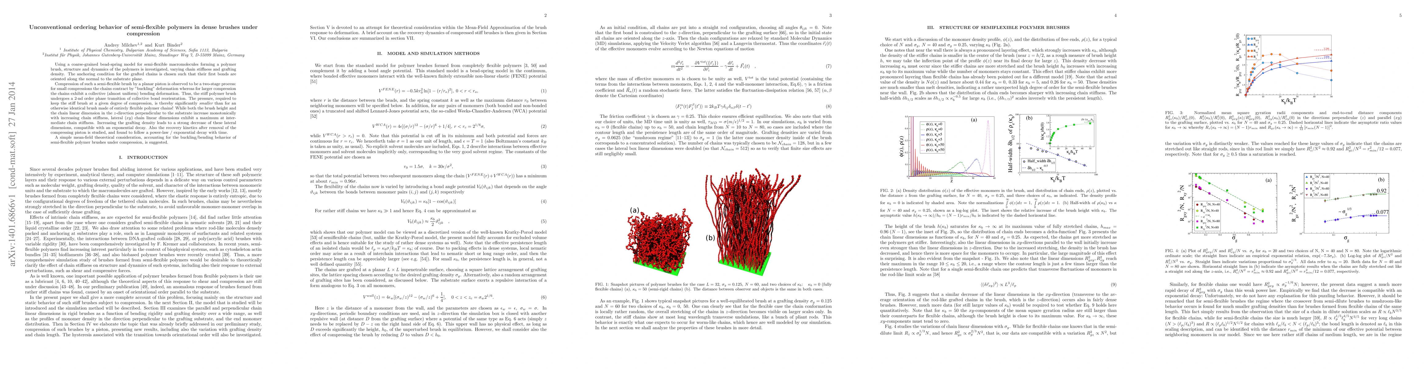This study investigates the behavior of semi-flexible polymers in dense polymer brushes under compression using a bead-spring model. It reveals a two-stage compression process: initial buckling followed by collective bending, leading to a phase transition in stiff brushes. The theoretical model explains the observed buckling/bending dynamics and the effects of chain stiffness and grafting density on brush dimensions.