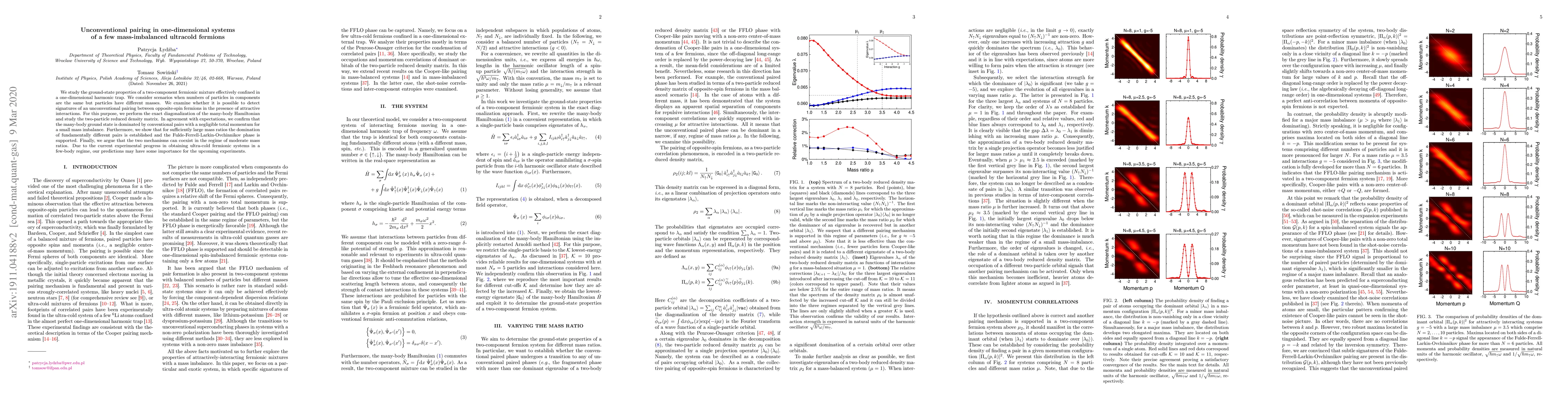 We study the ground-state properties of a two-component fermionic mixture effectively confined in a one-dimensional harmonic trap. We consider scenarios when numbers of particles in components are the same but particles have different masses. We examine whether it is possible to detect signatures of an unconventional pairing between opposite-spin fermions in the presence of attractive interactions. For this purpose, we perform the exact diagonalization of the many-body Hamiltonian and study the two-particle reduced density matrix. In agreement with expectations, we confirm that the many-body ground state is dominated by conventional pairs with a negligible total momentum for a small mass imbalance. Furthermore, we show that for sufficiently large mass ratios the domination of fundamentally different pairs is established and the Fulde-Ferrell-Larkin-Ovchinnikov phase is supported. Finally, we argue that the two mechanisms can coexist in the regime of moderate mass ratios. Due to the current experimental progress in obtaining ultra-cold fermionic systems in a few-body regime, our predictions may have some importance for the upcoming experiments.
