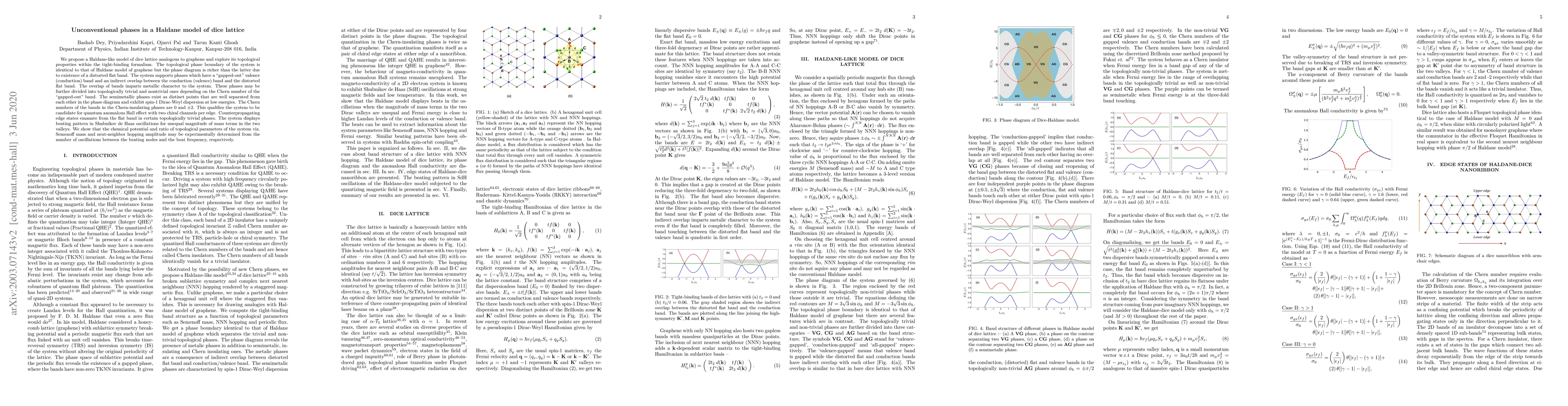 We propose a Haldane-like model of dice lattice analogous to graphene and explore its topological properties within the tight-binding formalism. The topological phase boundary of the system is identical to that of Haldane model of graphene but the phase diagram is richer than the latter due to existence of a distorted flat band. The system supports phases which have a "gapped-out" valence (conduction) band and an indirect overlap between the conduction (valence) band and the distorted flat band. The overlap of bands imparts metallic character to the system. These phases may be further divided into topologically trivial and nontrivial ones depending on the Chern number of the "gapped-out" band. The semimetallic phases exist as distinct points that are well separated from each other in the phase diagram and exhibit spin-1 Dirac-Weyl dispersion at low energies. The Chern numbers of the bands in the Chern-insulating phases are $0$ and $\pm2$. This qualifies the system to be candidate for quantum anomalous Hall effect with two chiral channels per edge. Counterpropagating edge states emanate from the flat band in certain topologically trivial phases. The system displays beating pattern in Shubnikov de Haas oscillations for unequal magnitude of mass terms in the two valleys. We show that the chemical potential and ratio of topological parameters of the system viz. Semenoff mass and next-neighbor hopping amplitude may be experimentally determined from the number of oscillations between the beating nodes and the beat frequency, respectively.