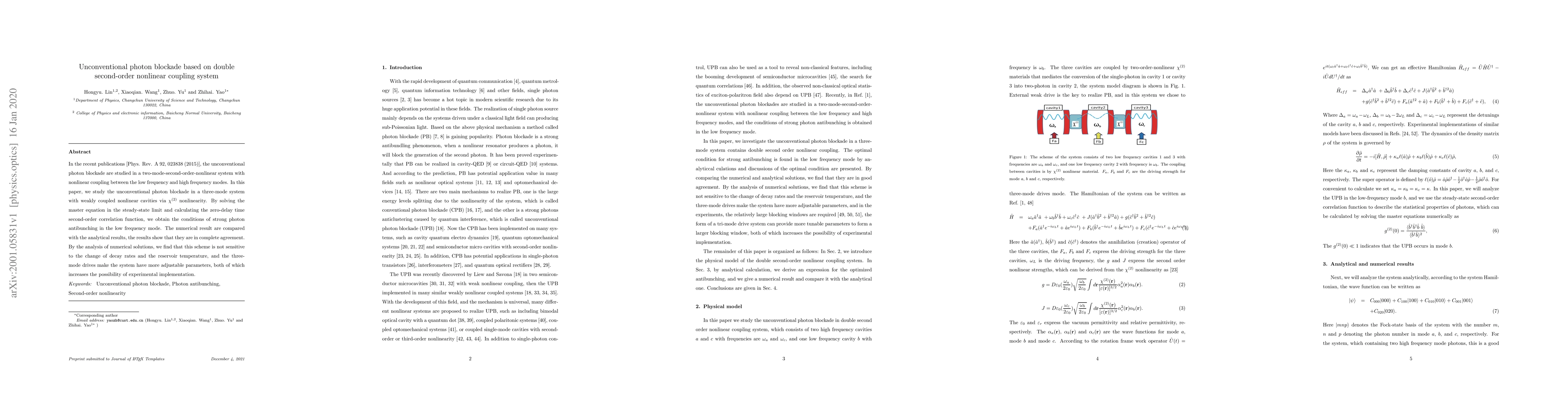 This paper investigates an unconventional photon blockade in a three-mode system with $\chi^{(2)}$ nonlinearity, demonstrating strong photon antibunching in the low-frequency mode. The study finds the scheme robust against decay rate and temperature variations, with enhanced experimental feasibility due to additional adjustable parameters.
