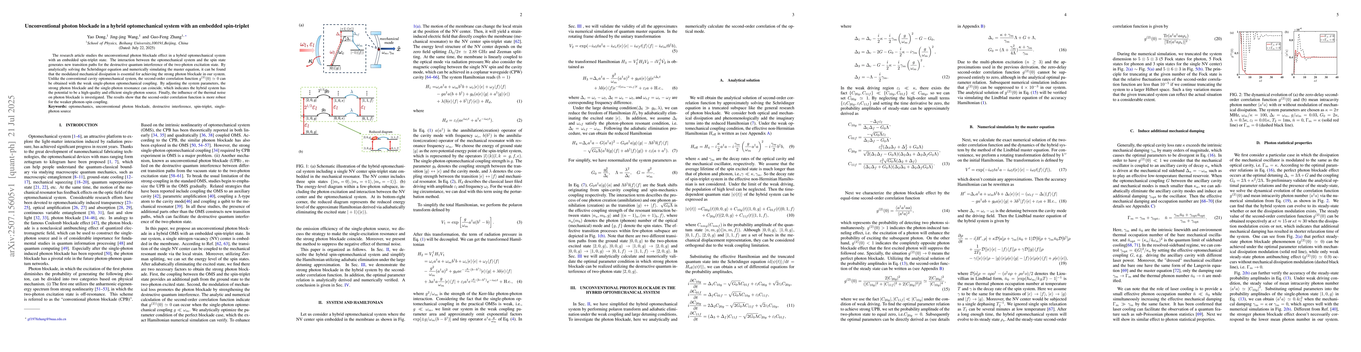 The research article studies the unconventional photon blockade effect in a hybrid optomechanical system with an embedded spin-triplet state. The interaction between the optomechanical system and the spin state generates new transition paths for the destructive quantum interference of the two-photon excitation state. By analytically solving the Schrodinger equation and numerically simulating the master equation, it can be found that the modulated mechanical dissipation is essential for achieving the strong photon blockade in our system. Unlike the conventional cavity optomechanical system, the second-order correlation function g(2)(0) =0 can be obtained with the weak single-photon optomechanical coupling. By adjusting the system parameters, the strong photon blockade and the single-photon resonance can coincide, which indicates the hybrid system has the potential to be a high-quality and efficient single-photon source. Finally, the influence of the thermal noise on photon blockade is investigated. The results show that the second-order correlation function is more robust for the weaker phonon-spin coupling.