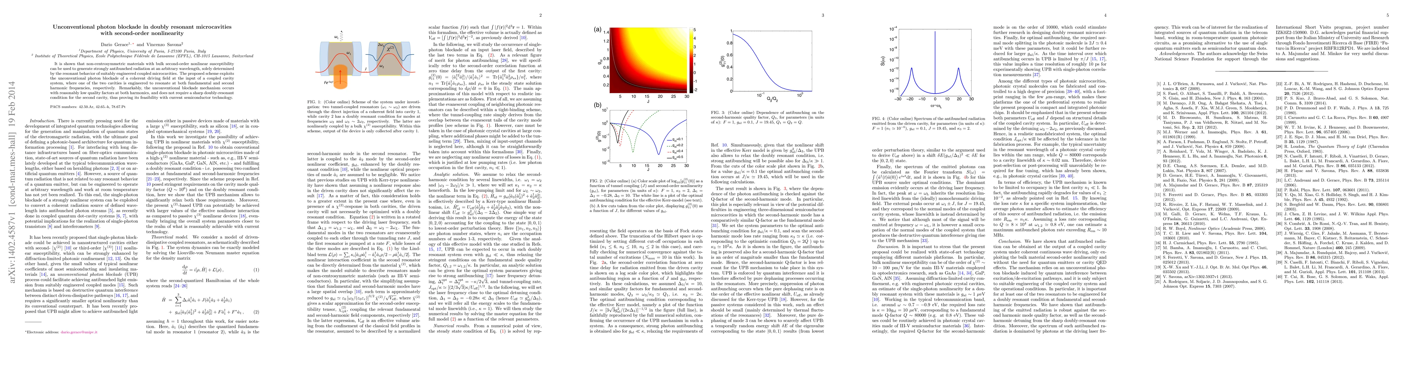 This paper demonstrates the generation of strongly antibunched radiation using non-centrosymmetric materials with second-order nonlinearity in doubly resonant microcavities. The unconventional photon blockade mechanism operates at low quality factors and does not require a strict doubly-resonant condition, making it feasible for current semiconductor technology.