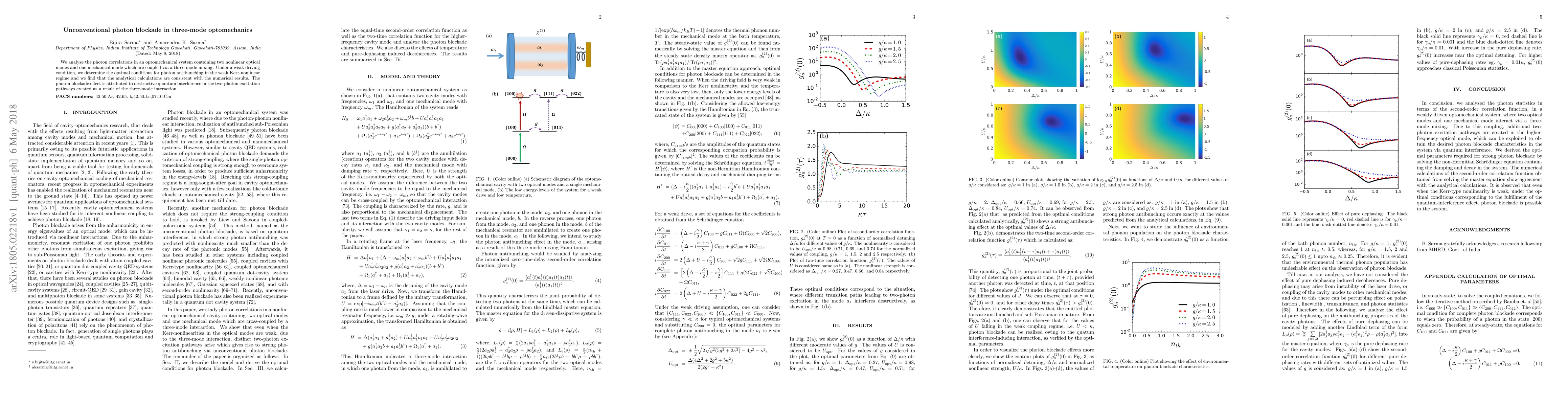 This paper investigates photon correlations in a three-mode optomechanical system, revealing optimal conditions for photon antibunching in the weak Kerr-nonlinear regime. The photon blockade effect is explained by destructive quantum interference in the two-photon excitation pathways due to three-mode interaction.