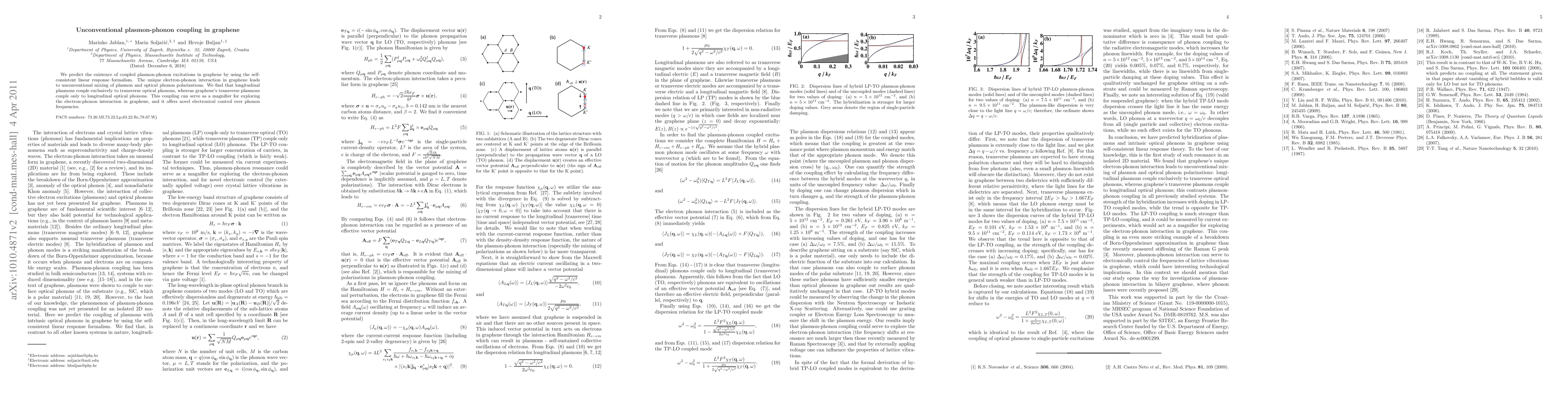 This study reveals unique plasmon-phonon coupling in graphene, showing that longitudinal plasmons couple with transverse optical phonons, while transverse plasmons couple with longitudinal optical phonons, differing from typical systems. The charge carrier concentration affects phonon frequencies, increasing those of transverse phonons and decreasing those of longitudinal phonons.