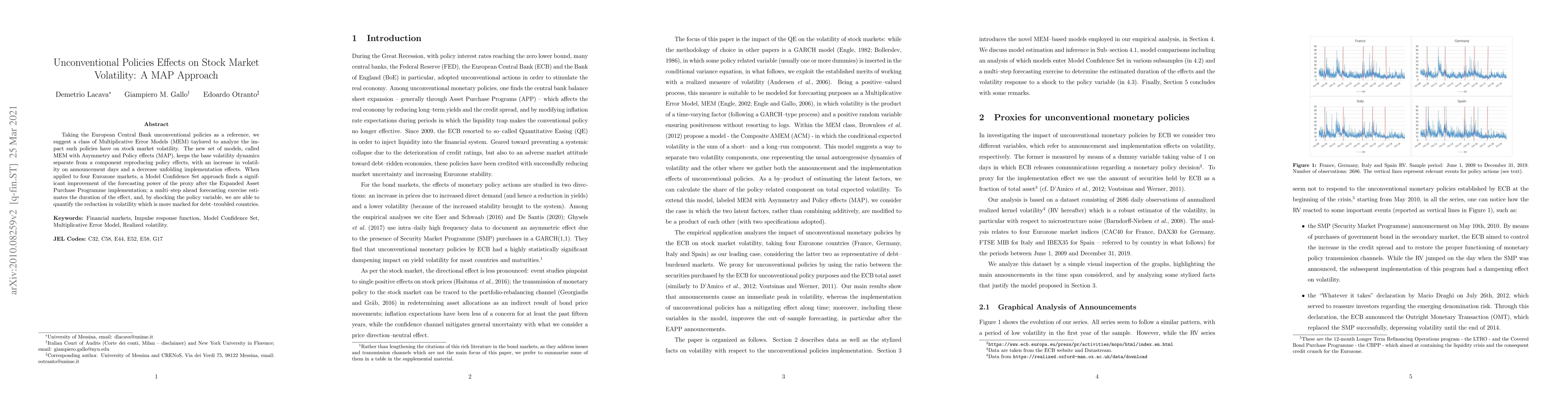 This paper proposes a new class of Multiplicative Error Models (MEM) with Asymmetry and Policy effects (MAP) to analyze the European Central Bank's unconventional policies' impact on stock market volatility. The MAP models show improved forecasting power post-Expanded Asset Purchase Programme, with a significant reduction in volatility, especially in debt-troubled Eurozone countries.