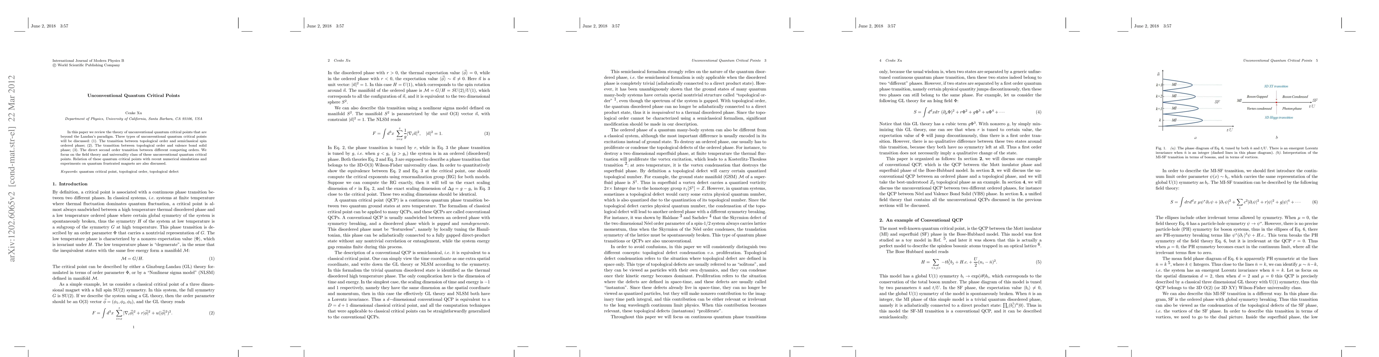 This paper reviews unconventional quantum critical points beyond Landau's paradigm, focusing on three types: transitions between topological and spin ordered phases, between topological and valence bond solid phases, and second-order transitions between competing orders. It examines their field theory and universality class, linking them to recent numerical simulations and experimental studies on quantum frustrated magnets.