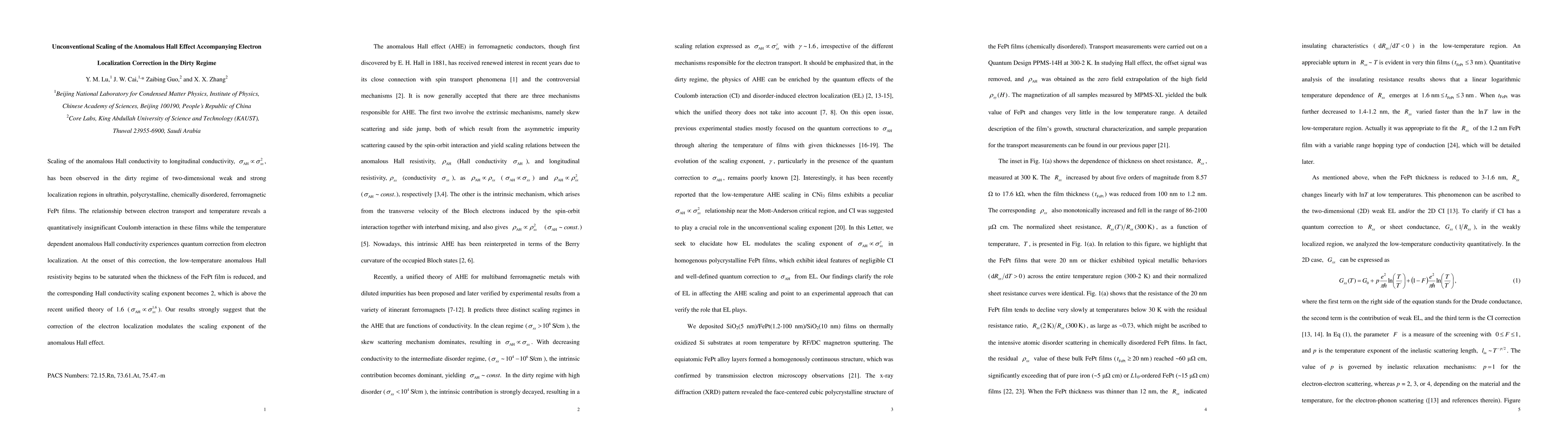 This study investigates the scaling behavior of the anomalous Hall effect in ultrathin, disordered ferromagnetic FePt films, revealing that electron localization correction significantly alters the scaling exponent from 1.6 to 2 in the dirty regime. The findings suggest a modulation of the anomalous Hall effect by electron localization, with minimal impact from Coulomb interactions.