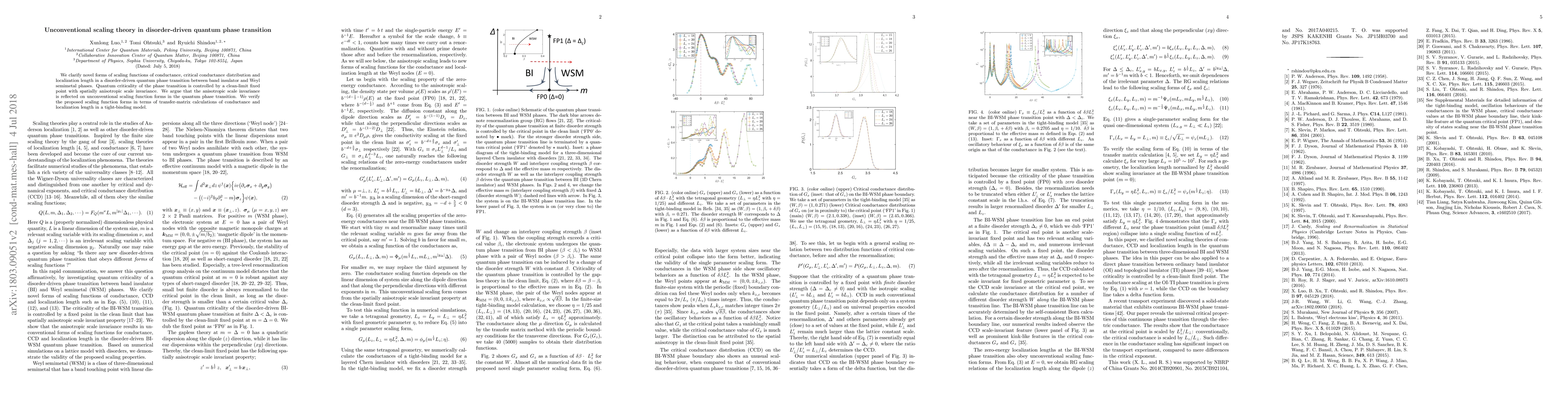 This paper explores novel scaling functions for conductance, critical conductance distribution, and localization length in a disorder-driven quantum phase transition between band insulator and Weyl semimetal phases, revealing anisotropic scale invariance controlled by a clean-limit fixed point. The proposed scaling functions are verified through transfer-matrix calculations in a tight-binding model.