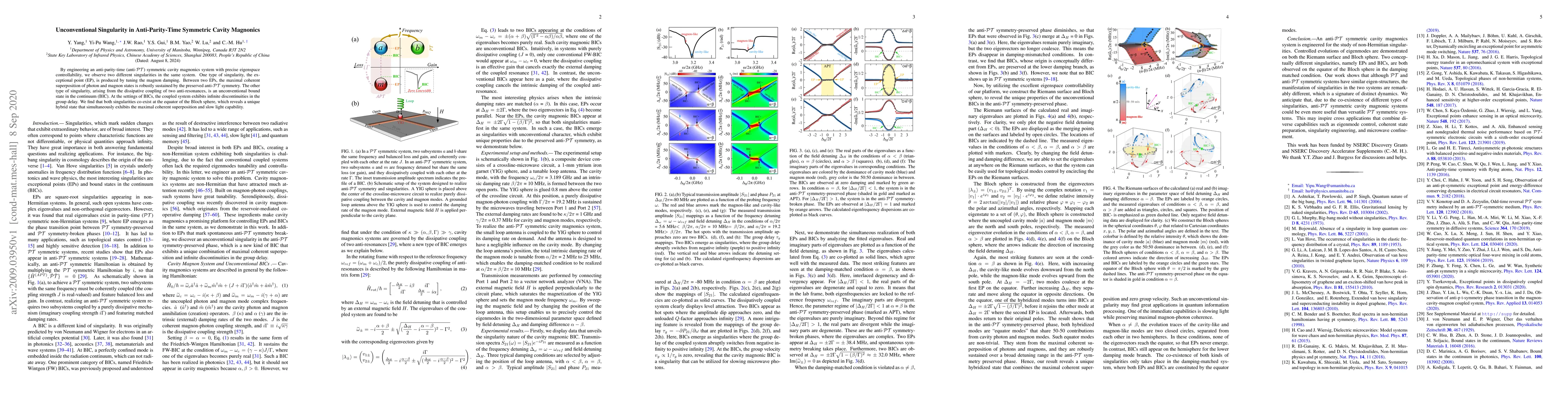 By engineering an anti-parity-time (anti-PT) symmetric cavity magnonics system with precise eigenspace controllability, we observe two different singularities in the same system. One type of singularity, the exceptional point (EP), is produced by tuning the magnon damping. Between two EPs, the maximal coherent superposition of photon and magnon states is robustly sustained by the preserved anti-PT symmetry. The other type of singularity, arising from the dissipative coupling of two anti-resonances, is an unconventional bound state in the continuum (BIC). At the settings of BICs, the coupled system exhibits infinite discontinuities in the group delay. We find that both singularities co-exist at the equator of the Bloch sphere, which reveals a unique hybrid state that simultaneously exhibits the maximal coherent superposition and slow light capability.