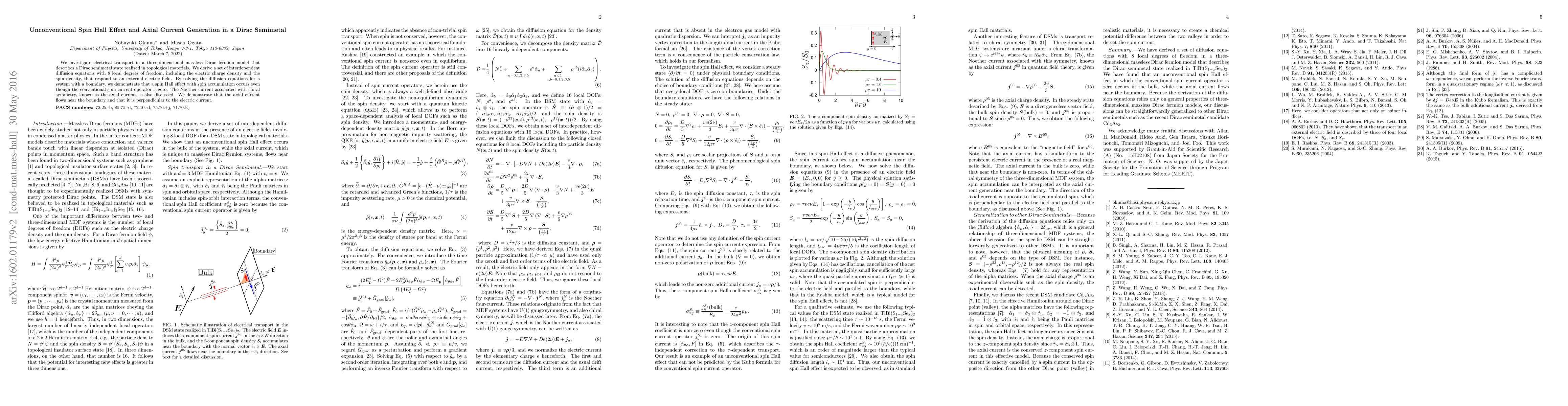 Summary: This research explores unconventional spin Hall effect and axial current generation in Dirac semimetals through derived diffusion equations. It reveals spin accumulation despite a zero conventional spin current, and shows an axial current flowing perpendicular to the electric current near the boundary.