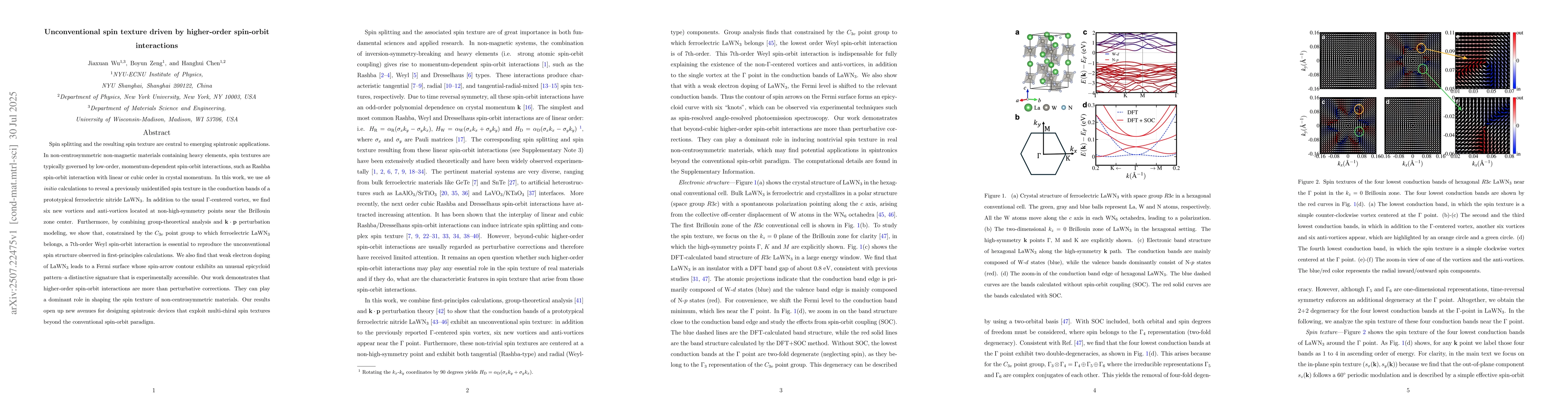 The research utilized \textit{ab initio} calculations to investigate the spin texture in LaWN$_3$, a ferroelectric nitride, revealing unconventional spin structures through higher-order spin-orbit interactions.