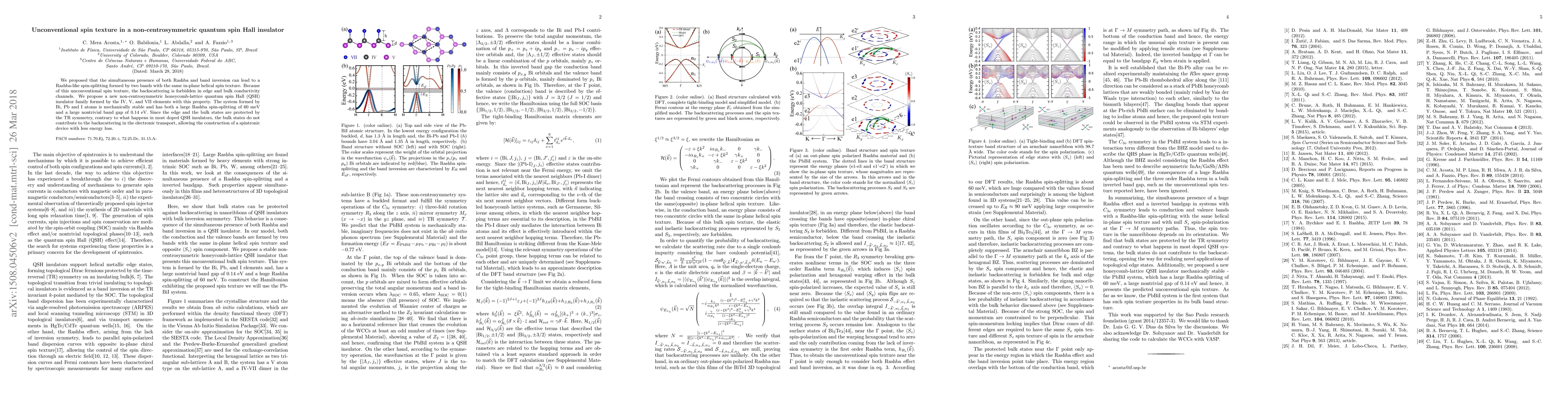This paper proposes a new class of non-centrosymmetric quantum spin Hall insulators with unconventional spin texture due to Rashba spin-splitting and band inversion. The system, composed of Bi, Pb, and I atoms, exhibits large spin-splitting and a nontrivial band gap, enabling low-backscattering spintronic devices.