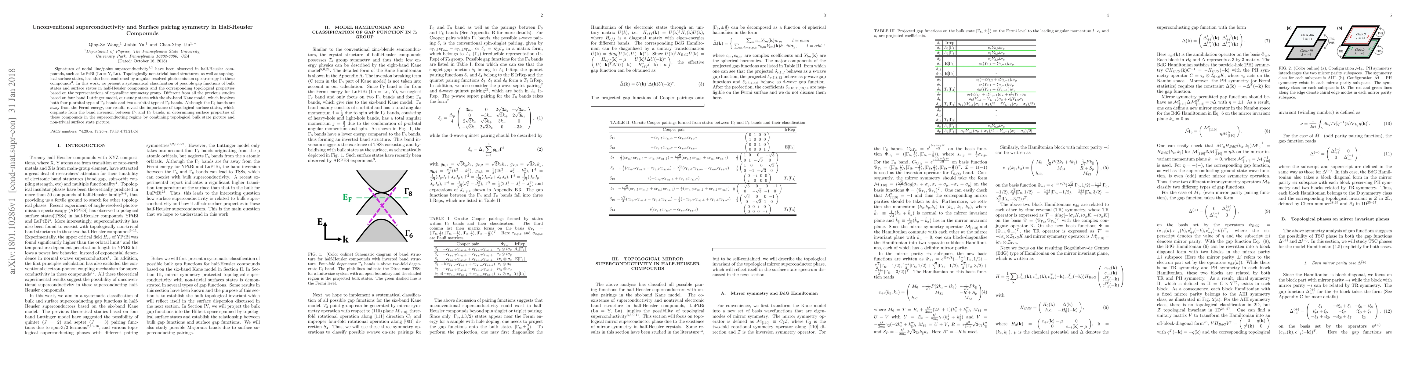 This research investigates unconventional superconductivity in half-Heusler compounds, revealing nodal line/point superconductivity and topologically non-trivial band structures. The study classifies gap functions and topological properties based on the six-band Kane model, highlighting the significance of topological surface states from band inversion in determining superconducting surface properties.