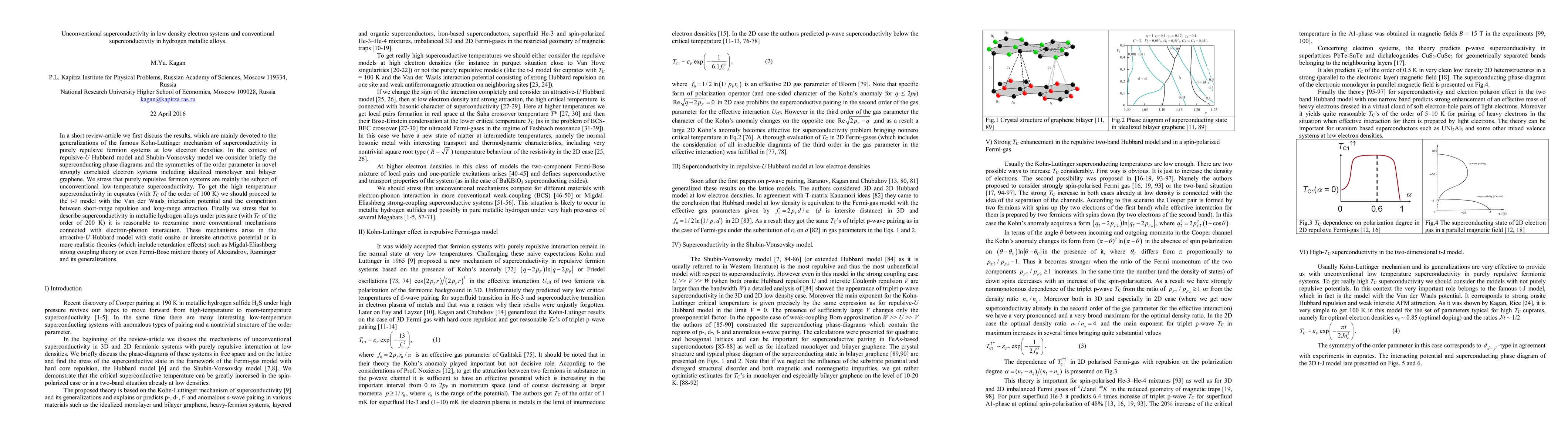 In a short review-article we first discuss the results, which are mainly devoted to the generalizations of the famous Kohn-Luttinger mechanism of superconductivity in purely repulsive fermion systems at low electron densities. In the context of repulsive-U Hubbard model and Shubin-Vonsovsky model we consider briefly the superconducting phase diagrams and the symmetries of the order parameter in novel strongly correlated electron systems including idealized monolayer and bilayer graphene. We stress that purely repulsive fermion systems are mainly the subject of unconventional low-temperature superconductivity. To get the high temperature superconductivity in cuprates (with T_C of the order of 100 K) we should proceed to the t-J model with the Van der Waals interaction potential and the competition between short-range repulsion and long-range attraction. Finally we stress that to describe superconductivity in metallic hydrogen alloys under pressure (with T_C of the order of 200 K) it is reasonable to reexamine more conventional mechanisms connected with electron-phonon interaction. These mechanisms arise in the attractive-U Hubbard model with static onsite or intersite attractive potential or in more realistic theories (which include retardation effects) such as Migdal-Eliashberg strong coupling theory or even Fermi-Bose mixture theory of Ranninger et al., and its generalizations.