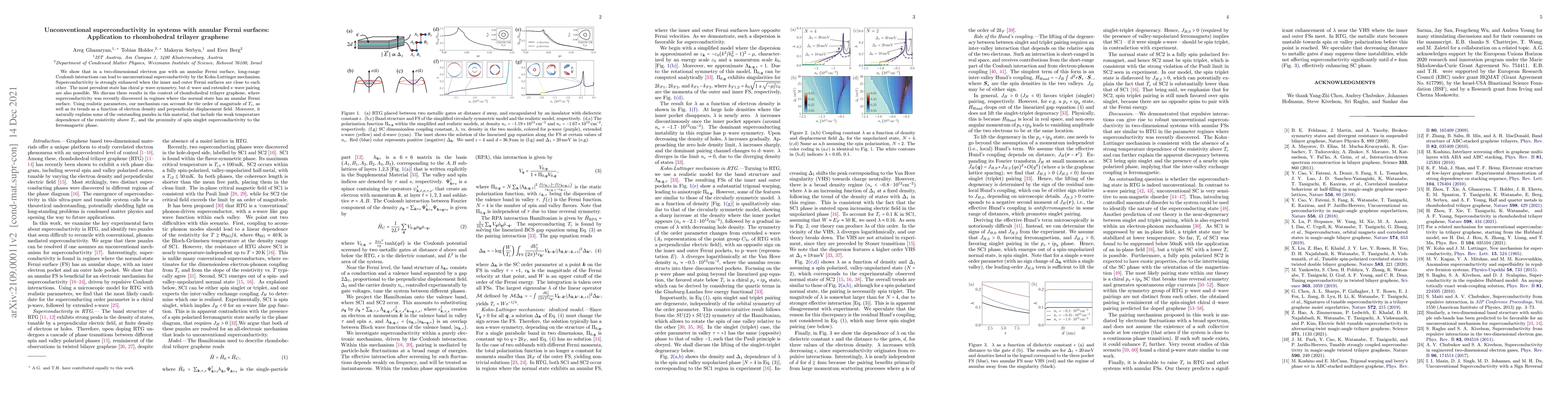 We show that in a two-dimensional electron gas with an annular Fermi surface, long-range Coulomb interactions can lead to unconventional superconductivity by the Kohn-Luttinger mechanism. Superconductivity is strongly enhanced when the inner and outer Fermi surfaces are close to each other. The most prevalent state has chiral $p$-wave symmetry, but $d$-wave and extended $s$-wave pairing are also possible. We discuss these results in the context of rhombohedral trilayer graphene, where superconductivity was recently discovered in regimes where the normal state has an annular Fermi surface. Using realistic parameters, our mechanism can account for the order of magnitude of $T_c$, as well as its trends as a function of electron density and perpendicular displacement field. Moreover, it naturally explains some of the outstanding puzzles in this material, that include the weak temperature dependence of the resistivity above $T_c$, and the proximity of spin singlet superconductivity to the ferromagnetic phase.