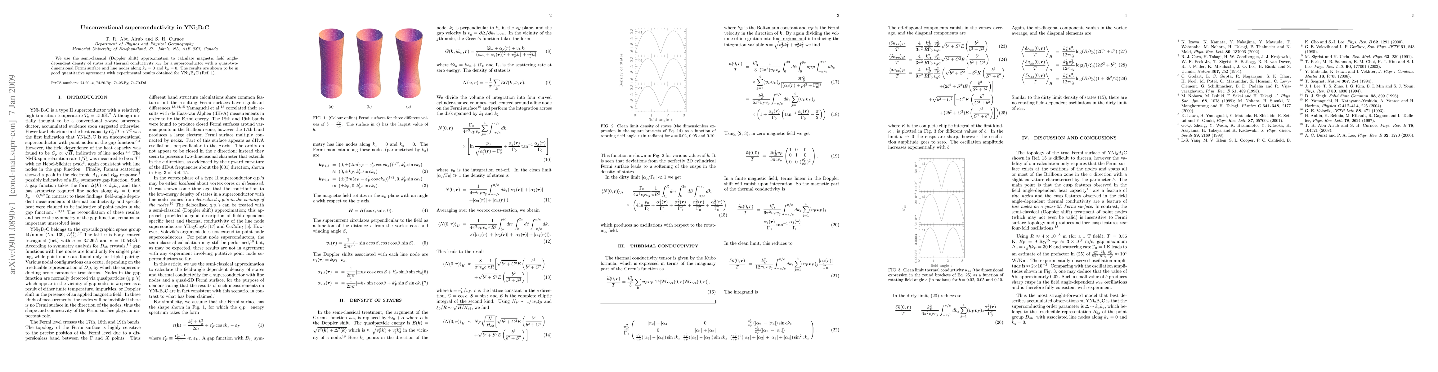 We use the semi-classical (Doppler shift) approximation to calculate magnetic field angle-dependent density of states and thermal conductivity kappa_zz for a superconductor with a quasi-two-dimensional Fermi surface and line nodes along k_x=0 and k_y=0. The results are shown to be in good quantitative agreement with experimental results obtained for YNi2B2C.