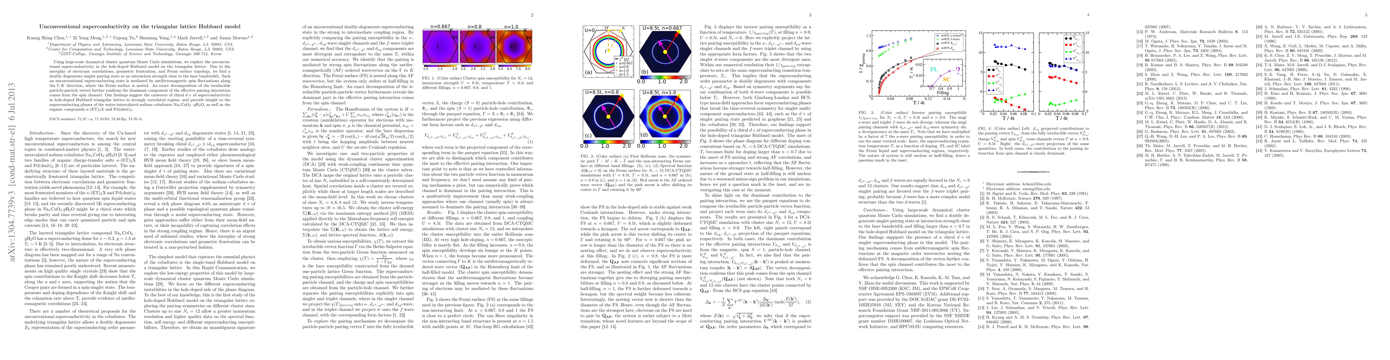 This paper investigates unconventional superconductivity in the hole-doped triangular lattice Hubbard model, revealing a doubly degenerate singlet pairing state mediated by antiferromagnetic spin fluctuations. The study supports the chiral $d +i d$ superconductivity observed in sodium cobaltates and organic compounds.