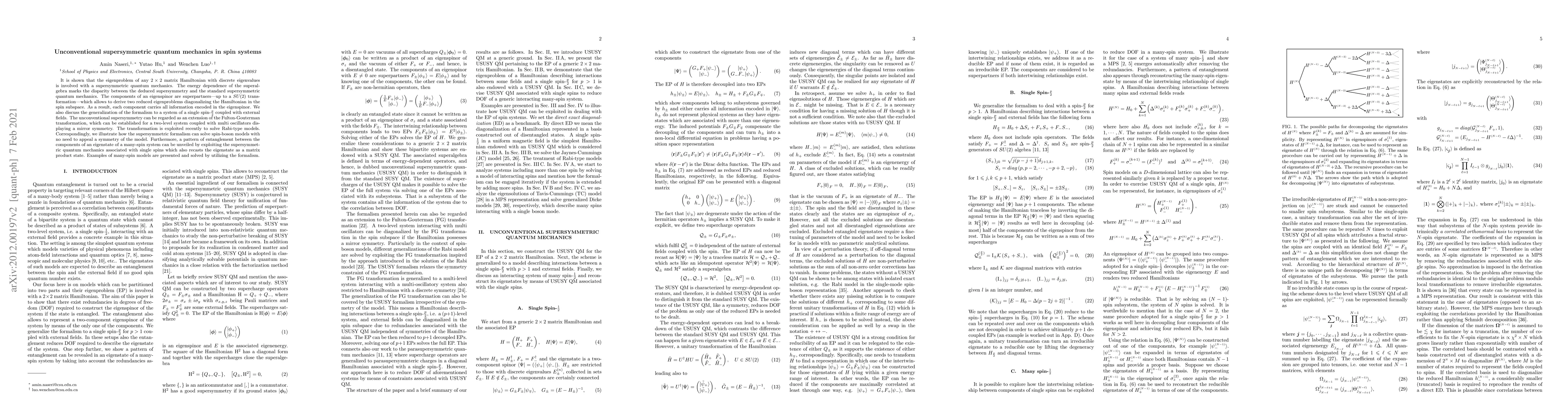 It is shown that the eigenproblem of any $2\times 2$ matrix Hamiltonian with discrete eigenvalues is involved with a supersymmetric quantum mechanics. The energy dependence of the superalgebra marks the disparity between the deduced supersymmetry and the standard supersymmetric quantum mechanics. The components of an eigenspinor are superpartners\textemdash up to a $SU(2)$ transformation\textemdash which allows to derive two reduced eigenproblems diagonalizing the Hamiltonian in the spin subspace. As a result, each component carries all information encoded in the eigenspinor. We also discuss the generalization of the formalism to a system of a single spin-$\frac{p}{2}$ coupled with external fields. The unconventional supersymmetry can be regarded as an extension of the Fulton-Gouterman transformation, which can be established for a two-level system coupled with multi oscillators displaying a mirror symmetry. The transformation is exploited recently to solve Rabi-type models. Correspondingly, we illustrate how the supersymmetric formalism can solve spin-boson models with no need to appeal a symmetry of the model. Furthermore, a pattern of entanglement between the components of an eigenstate of a many-spin system can be unveiled by exploiting the supersymmetric quantum mechanics associated with single spins which also recasts the eigenstate as a matrix product state. Examples of many-spin models are presented and solved by utilizing the formalism.