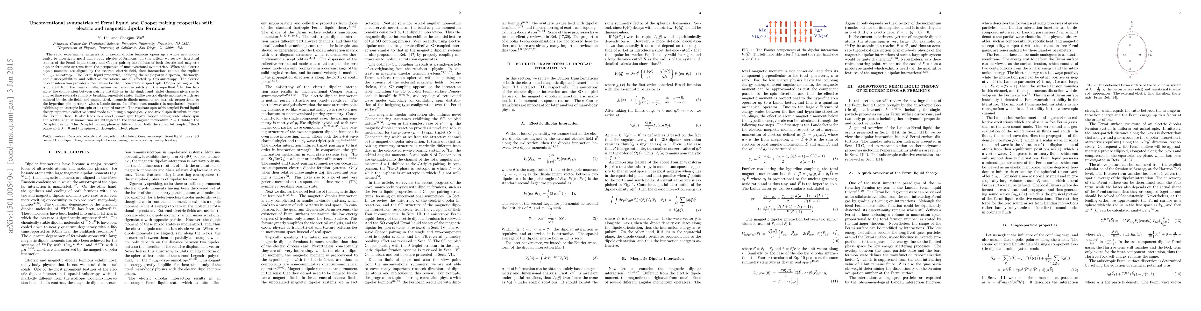 This paper reviews theoretical studies of Fermi liquid theory and Cooper pairing in ultra-cold dipolar fermions, focusing on unconventional symmetries. It highlights how electric dipole moments aligned by external fields lead to $d_{r^2-3z^2}$ anisotropic interactions, affecting Fermi liquid properties and enabling unconventional spin triplet Cooper pairing. Magnetic dipole moments induce a spin-orbit coupled Fermi liquid with a topologically non-trivial spin distribution and a novel $J$-triplet pairing state.