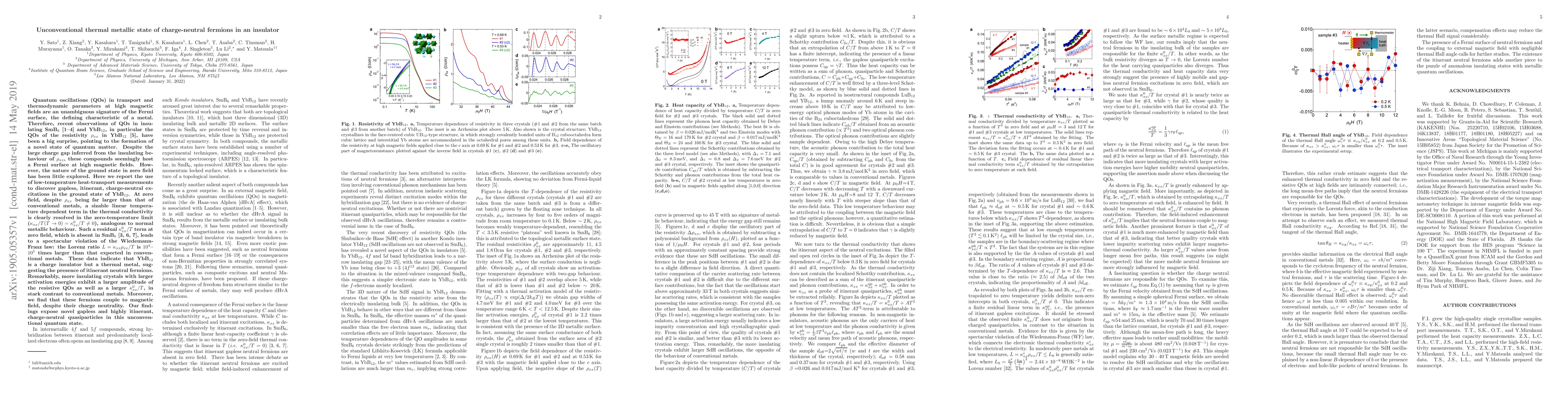 This paper reports the discovery of an unconventional thermal metallic state in the insulator YbB$_{12}$, where charge-neutral fermions exhibit quantum oscillations and a linear temperature-dependent thermal conductivity despite a large charge gap. This leads to a dramatic violation of the Wiedemann-Franz law, indicating itinerant neutral fermions that couple to magnetic fields, challenging conventional metallic behavior.