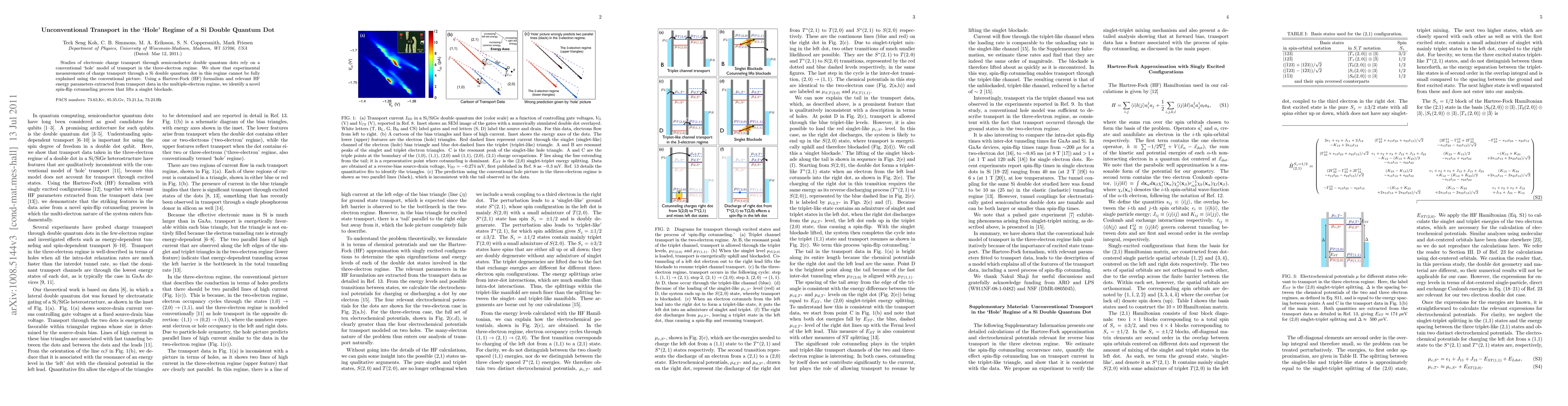 This paper reveals that conventional transport models fail to explain charge transport in a Si double quantum dot in the three-electron regime, identifying a novel spin-flip cotunneling process that overcomes singlet blockade, as demonstrated through Hartree-Fock formalism.